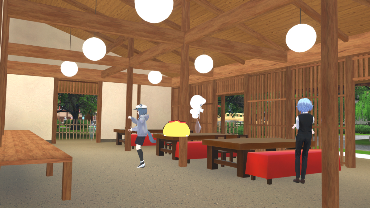 すぐ近くには、「Vketラウンジ」が登場。前回のバーチャルマーケットで初登場した、コミュニティイベント等を自由に開けるラウンジとして、和風テイストの内装やアイテムで楽しめる。すでにVket開催前からイベントが行われ、カストラート等のコミュティコラボメニューもある。