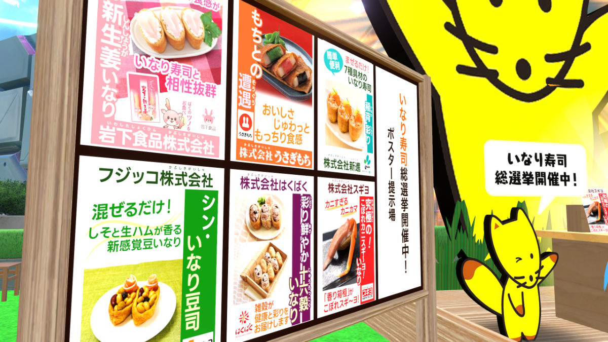 駅を降りてすぐに現れるのが、インパクト大の大きいキツネのキャラクターが目立つ「みすずコーポレーション」ブース。主なコンテンツは「オリジナルいなり寿司の総選挙」として、各社のいなり寿司の3Dモデルが並んでいる。