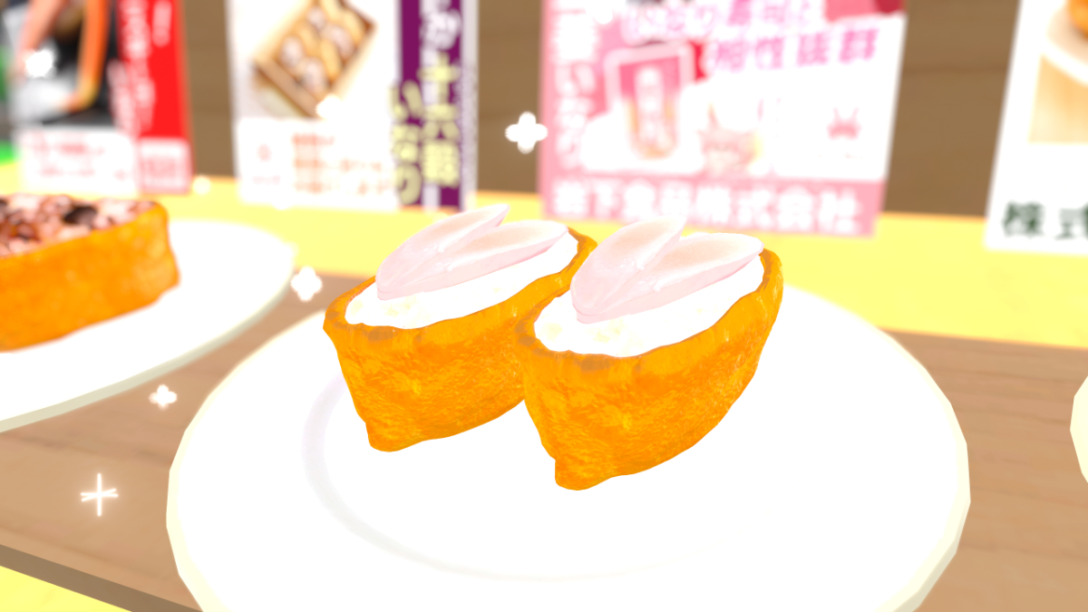 みすずコーポレーションはバーチャルマーケット2024Winterでも2月11日の「初午いなりの日」に向けたプロモーションの場として参加。今回は他社を巻き込む形で乗り込んでいるのがおもしろい。岩下の新生姜はかざりとしてトレードマークの生姜をハートに見立てたり、穀物メーカーのはくばくは十六穀米を用いたいなり寿司を用意するなど、各社の個性があふれるいなり寿司が展示されている。