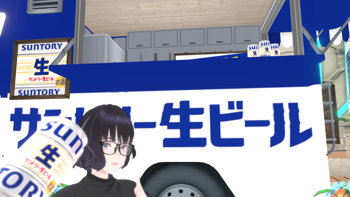 駅を降りると目に飛び込んでくるのは「サントリー」ブース。これまで、VRChat内の飲み会文化に対し、ノンアルコールドリンクを推奨してきたサントリーが、ついに「生ビール」を解禁したというのには個人的に驚いた。また、アンケートに答えると3Dモデルがもらえるキャンペーンも実施。これは、ユーザーの強い要望があってのことだという。