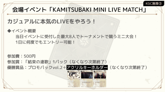 カジュアルに本気のLIVE(=神椿TCGバトル)をやろう!」をコンセプトとしたミニ大会イベント。当日イベント会場にて受付を行い、最大8人でトーナメントを実施。1日に何度でもエントリー可能となっている。