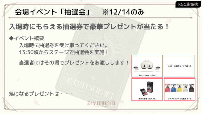 当日13:00までの入場でもらえる抽選券で参加可能。