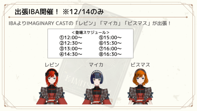 大会を盛り上げるゲストとして、ギャラリー併設型カフェ「IMAGINARY BASE AKIHABARA」から“IMAGINAY CAST”(バーチャルの姿で接客を行うカフェスタッフ)の登場が決定。12月14日(日)の下記の時間の登場となっている。