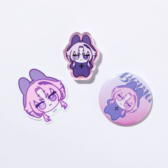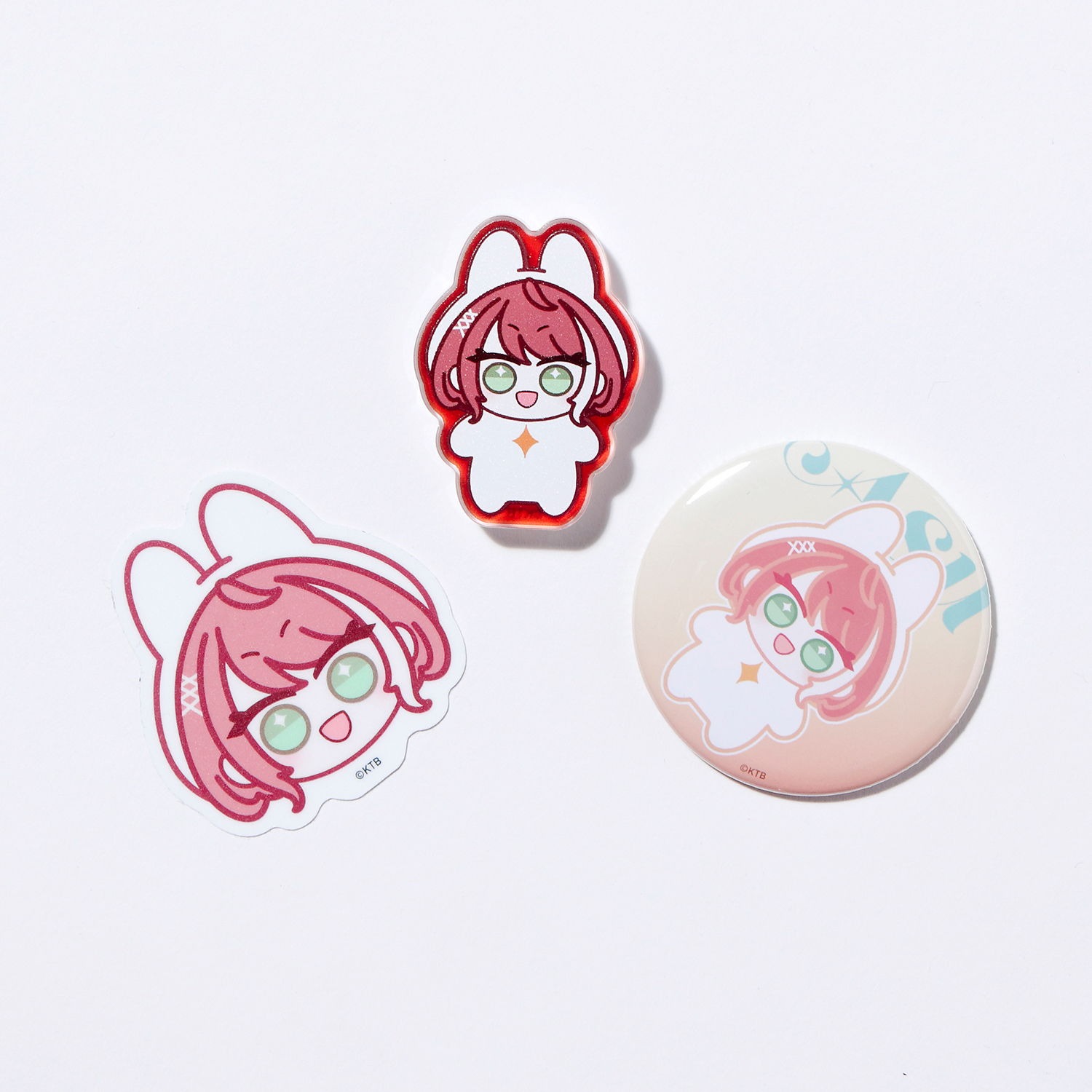 ミニキャラデザインの缶バッジ、ステッカー、アクリルマスコット3点セット