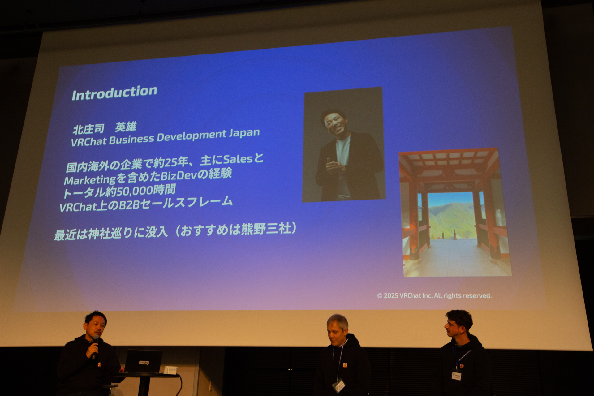 本記事ではその基調講演をレポート。2025年にVRChat inc.に加わった初の日本人社員・北庄司英雄氏(Buisiness Development Japan)、そして本国から駆けつけたCasey Wilms氏(VP of Product、Design&Production)、Jeremy Muhlfelder氏(Vice President of Operations & Legal)が語った「VRChatと日本市場の現在地」についてお伝えできれば幸いだ。