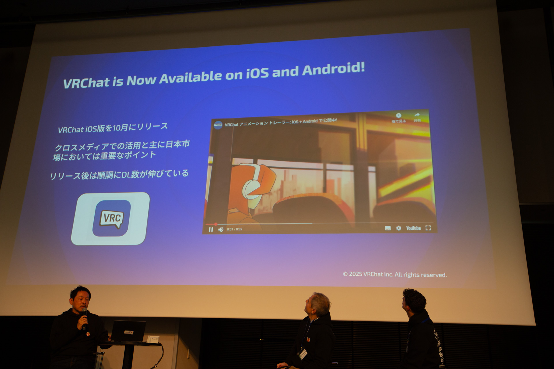 続いて、今年10月にリリースされたiOS版についても触れられた。改めて語られたのは、リリースの目的がクロスメディア活用と日本市場へのリーチであること。ちなみに、基調講演後の囲み取材では、iOS版リリース後2週間は、VRChat新規ユーザーの60%が日本ユーザーになったらしく、「日本市場へのリーチ」は早くも目的を達成したことがうかがえた。