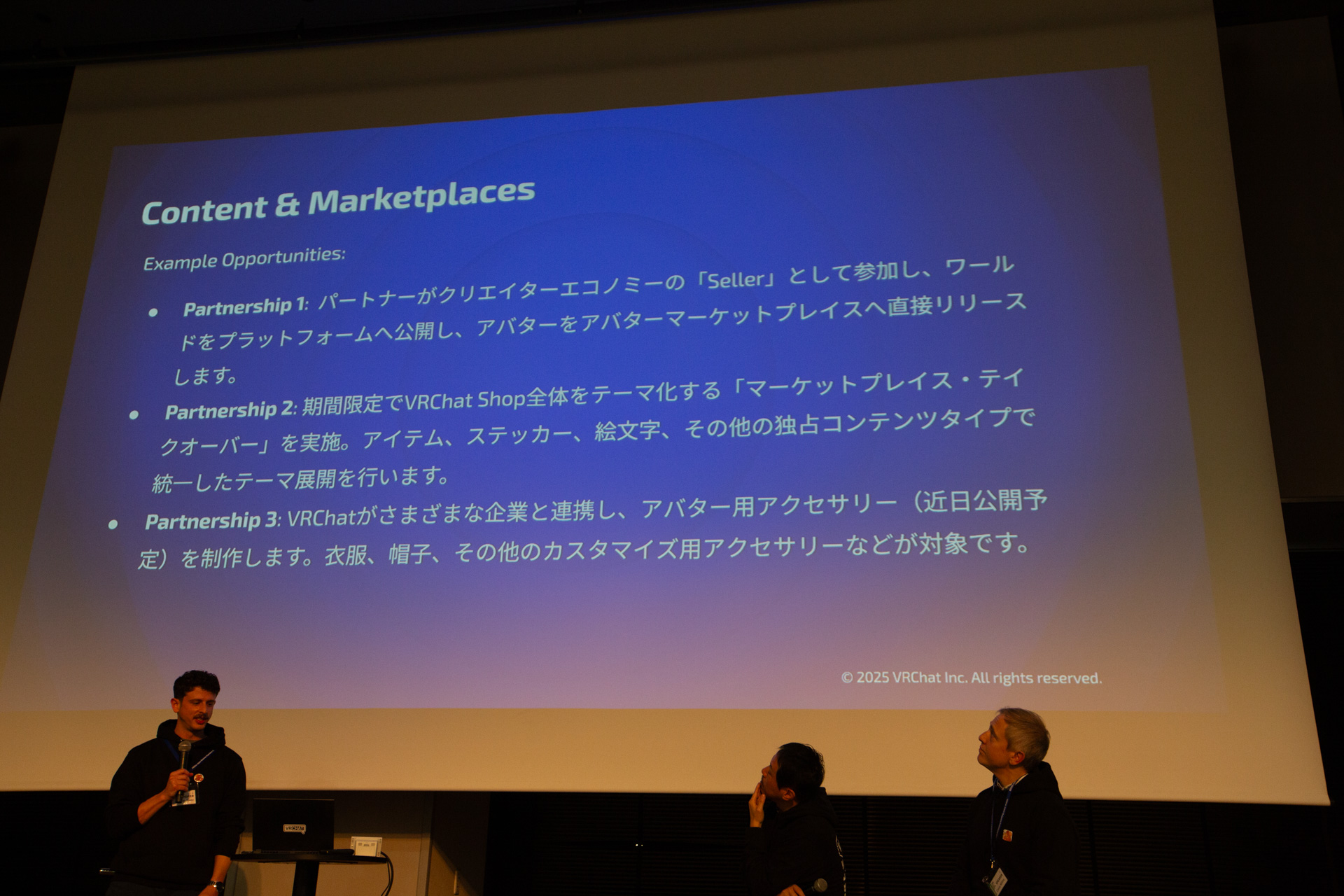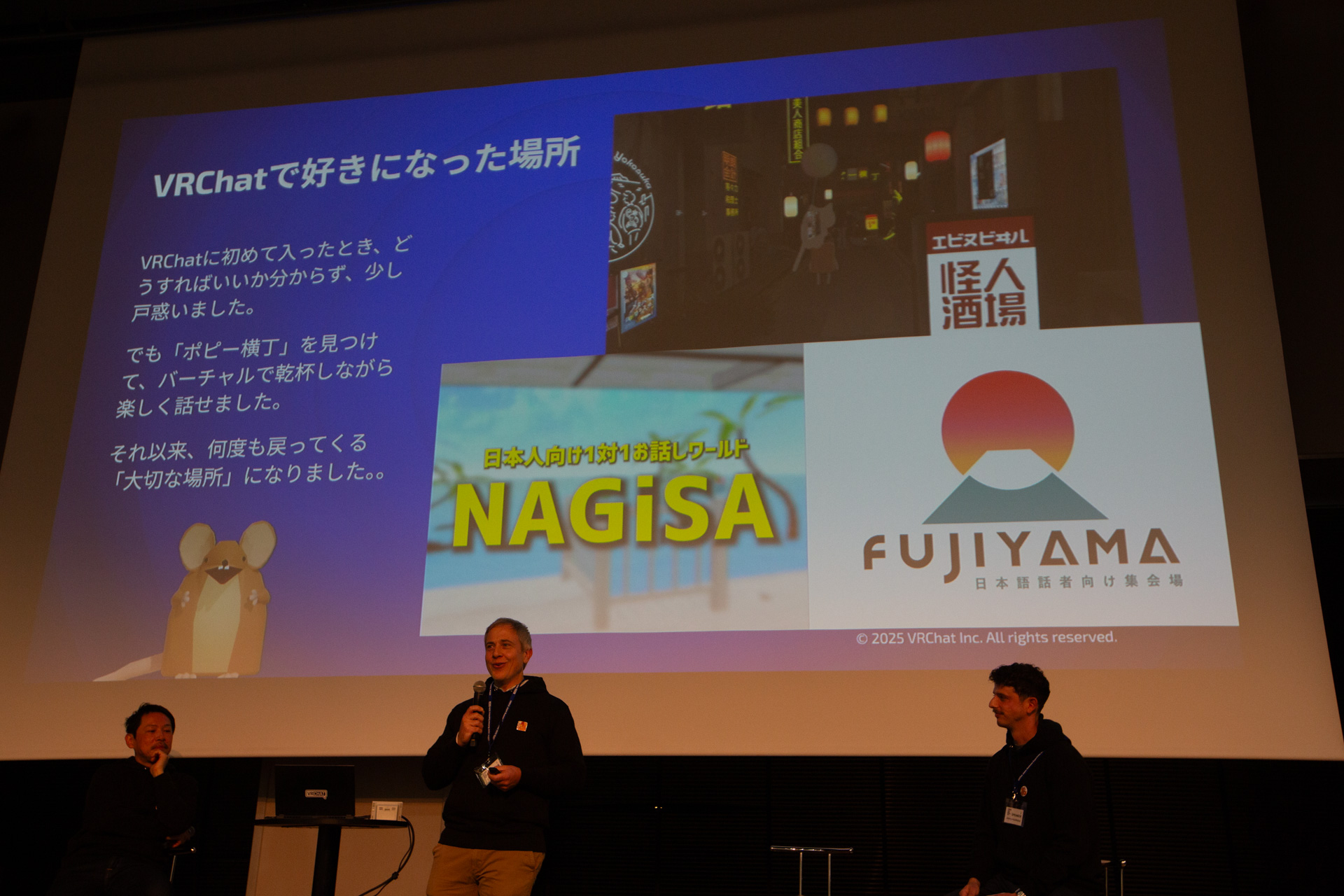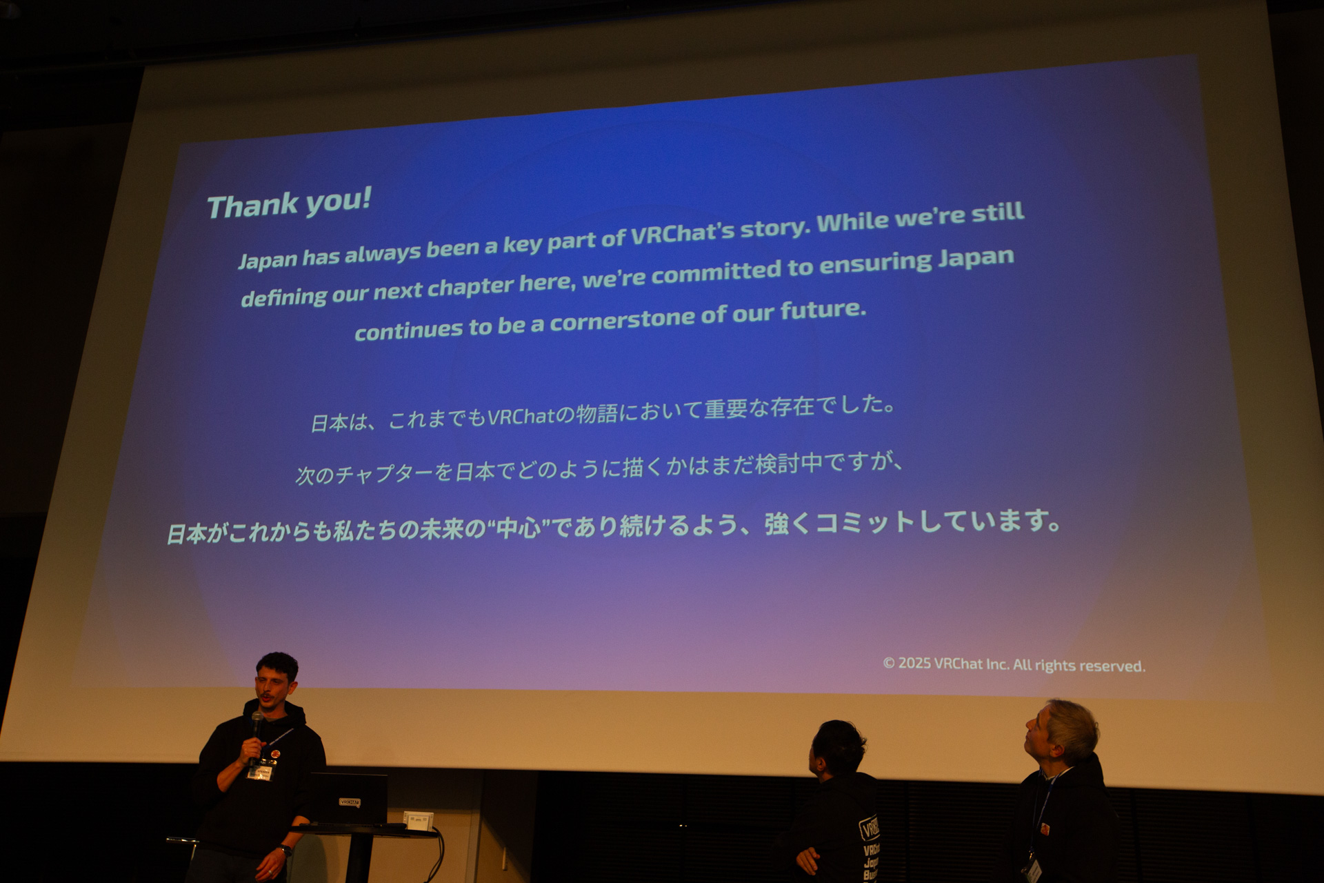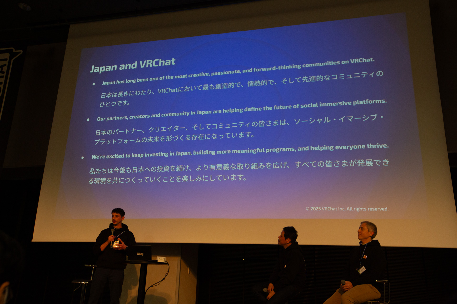 とりわけ大きな注目を集めたのが、運営企業・VRChat inc.による基調講演だ。これまで、公の場に姿を現すことがほとんどなかったVRChat inc.が、大勢の人を前にVRChatについて語るまたとない機会となった。