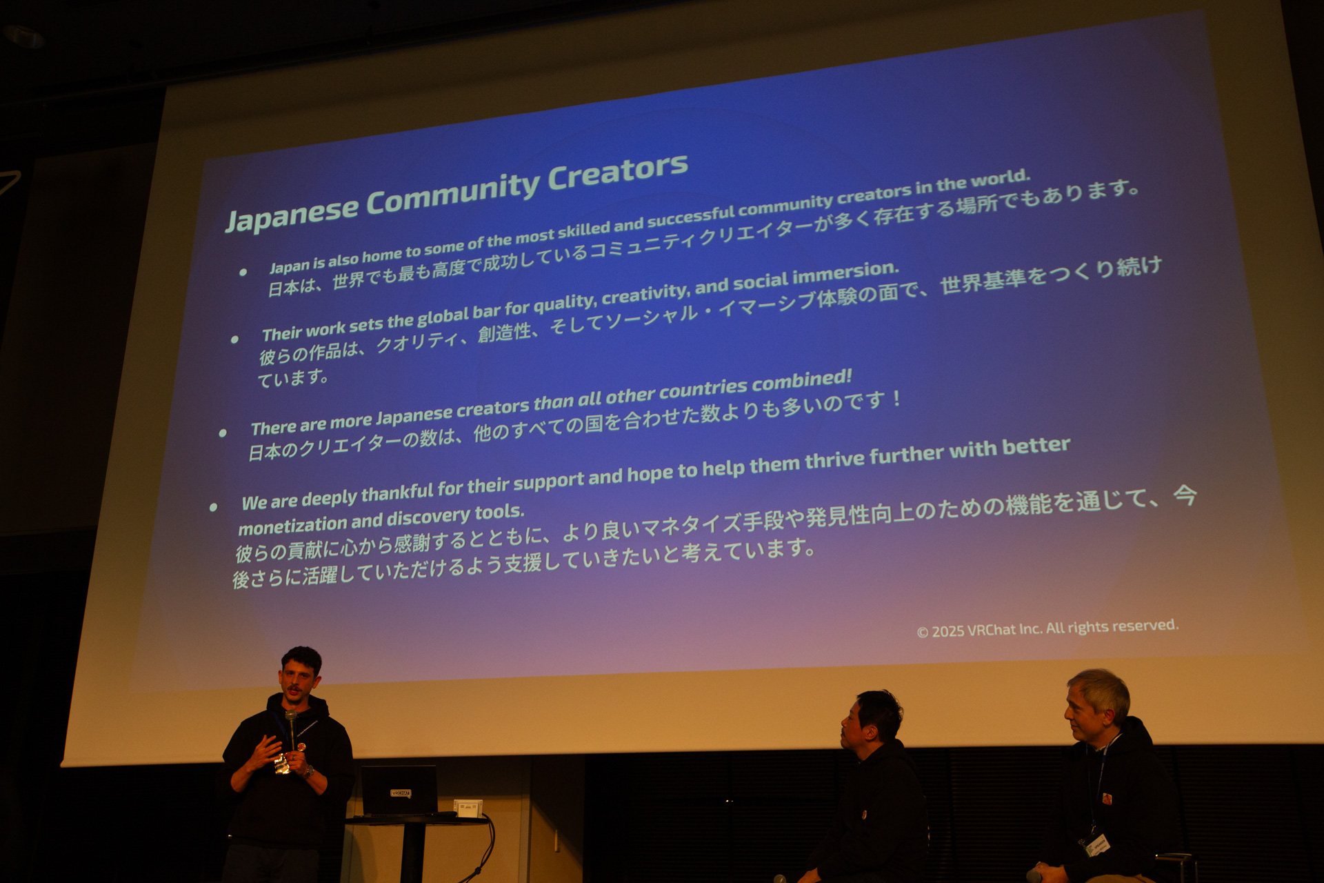 最後に登壇したJeremy Muhlfelder氏は、日本市場への強いコミットメントを表明した。「日本はVRChatにおいて最も創造的、情熱的、先進的なコミュニティを持つ」と述べつつ、日本のクリエイター総数は他のすべての国のクリエイター総数よりも多いと明かした。「日本のVRChat民は非常にクリエイティブ」とは体感値として語られることは多かったが、まさかの公式からの表明には筆者も驚かされた。