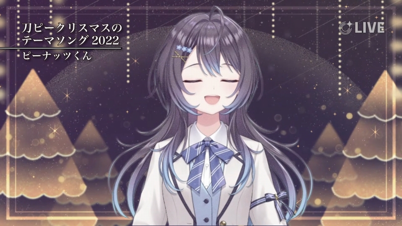 そんなことを思っていると、4曲目は、ミュージシャンとしても大活躍しているピーナッツくんの「刀ピークリスマスのテーマソング 2022」。クリスマスの恒例になっているピーナッツくんと、にじさんじの剣持刀也さんの生配信では、毎年、ピーナッツくん作詞作曲のテーマソングが披露されるのだが、その2022年版だ。まさかの選曲に配信のチャット欄には「?」や「w」といった反応も流れていく。