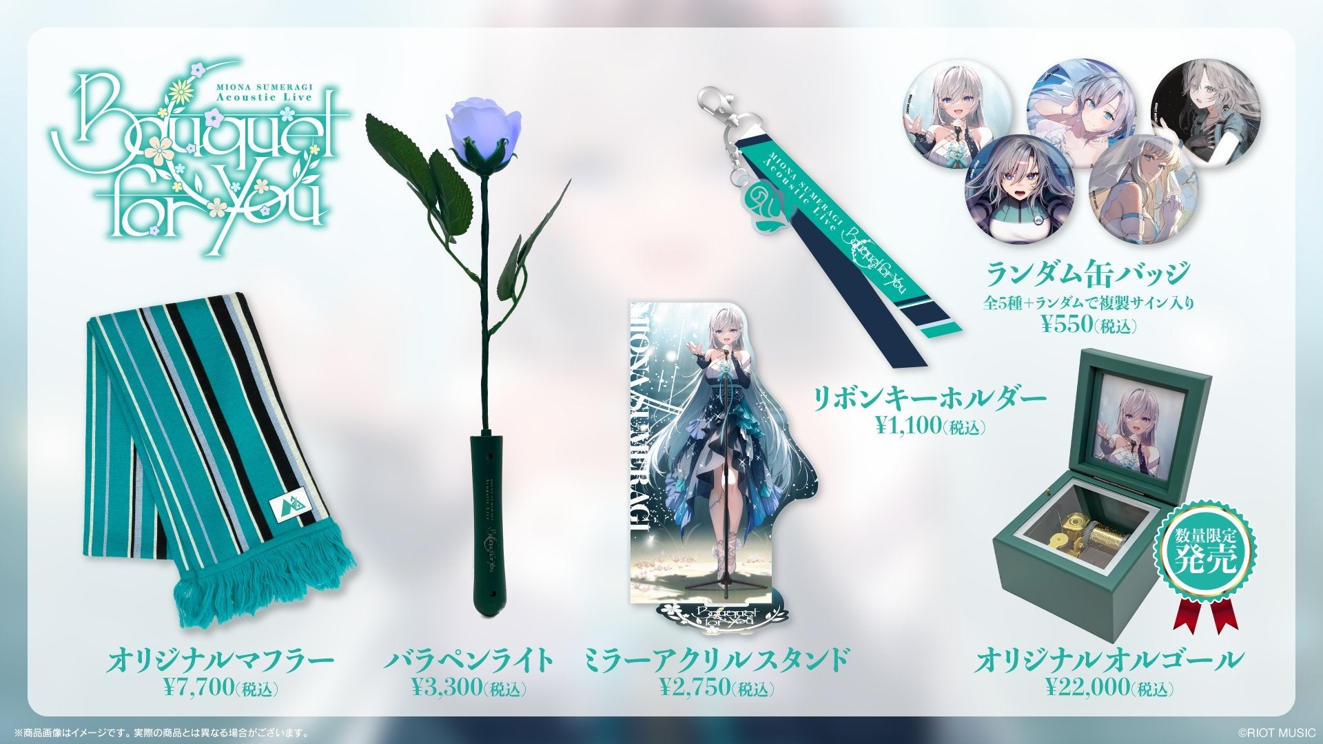 「バラペンライト」「ミラーアクリルスタンド」「リボンキーホルダー」は完売しておりますが、本公演の物販スペースにて一部商品の販売を予定しています。なお、皇 美緒奈 1stシングル『セントエルモの火』のオルゴールアレンジが楽しめる「オリジナルオルゴール」は数量限定につき、再販の予定はございません。この機会をお見逃しなく。
