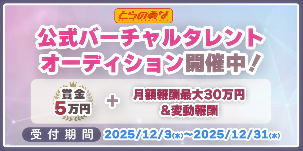 虎の穴は3日より、とらのあな公式VTuberのバーチャルタレントオーディションを開催している(オーディションサイト)。応募締め切りは12月31日までとなっている(応募フォーム)。主な活動内容は、ゲーム実況・雑談などのライブ配信、歌ってみた・オリジナル動画配信などの動画投稿、SNS運用、イベント出演、グッズ製作販売などとなっている。