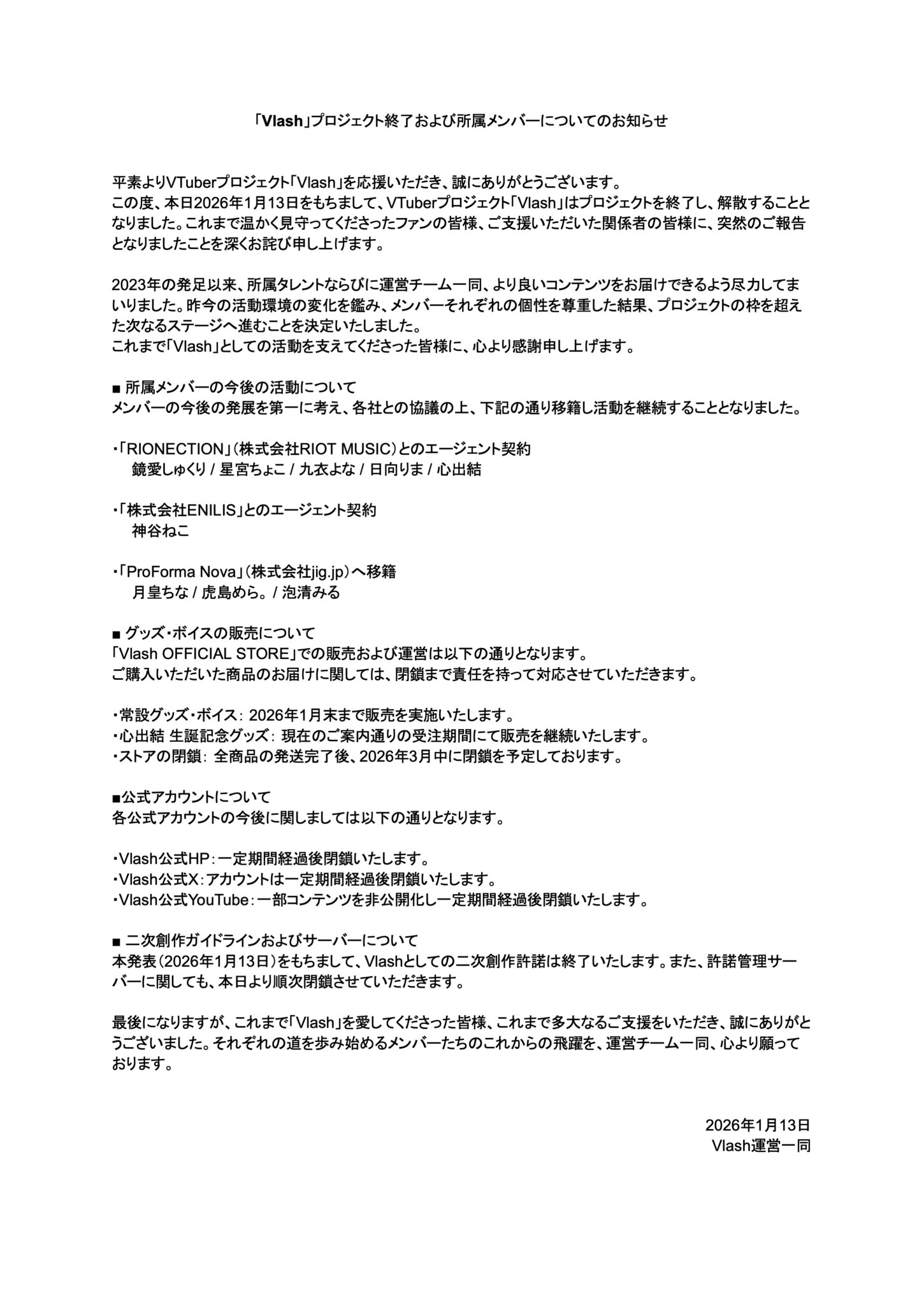 この度、本日2026年1月13日をもちまして、VTuberプロジェクト「Vlash」はプロジェクトを終了し、解散することとなりました。これまで温かく見守ってくださったファンの皆様、ご支援いただいた関係者の皆様に、突然のご報告となりましたことを深くお詫び申し上げます。