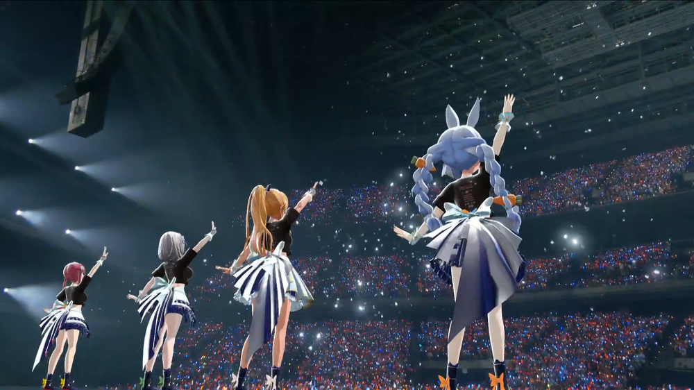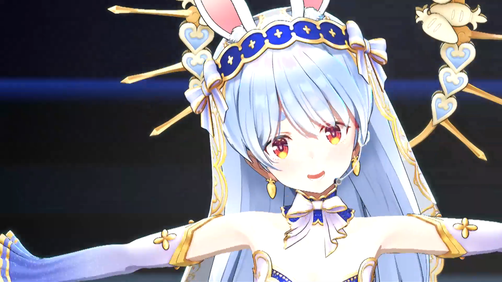 会場が暗転した後、通常衣装姿に戻ってステージに現れたぺこらさんは、「今こそ、全人類兎化計画を遂行する!」と宣言した後、ソロ曲の「全人類 兎化計画!」を歌い始めた。さっきまで、4色が入り混じっていた客席は、一瞬でライトブルー一色に変化し、軽快に歌い踊るぺこらさんの動きや曲に合わせて揺れている。そして、1番を歌い終えると、バンドの演奏が別の曲へとチェンジ。ぺこらさんの「あんたたち~兎田りさいたるへようこそ~」という台詞で始まる「昇天直前Love it LIVE」だ。ソロ曲のメドレー披露という嬉しい展開に会場が沸く中、兎田さんは「ララララビット!!」も披露。最後は、女神衣装に着替えて「兎座ストーリー」を歌い上げた。さっきまでの可愛いぺこらさんとはガラリと変わり、高貴で美しいオーラを放って、広い会場を埋める約20000人の観客を引き込んでいく。