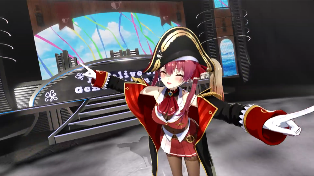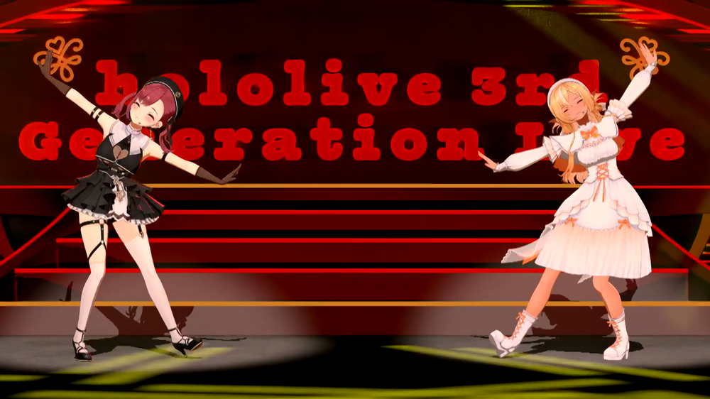 フレアさんとマリンさんのMCでは、「許婚っきゅん」がフレアさんの選曲だったことや、「ラフミーテンダー」はノエルさんからのリクエストだったことなどが紹介された。そして、マリンさんは、許婚モードで妙にグイグイ来るフレアさんをステージから追い出して、ぺこらさんを召喚。