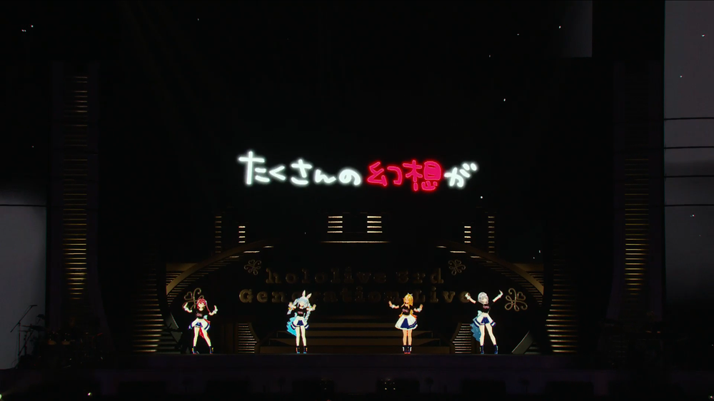 会場の記者席に着くと、正面にメインステージとなる大型ディスプレイ、その左右にサブのディスプレイが設置されているのが見える。アリーナクラスの大規模会場でのバーチャルライブとしてはオーソドックスな配置だ。会場のリアルカメラが個性的なファングッズを掲げる客席のファンたちを映し、会場が盛り上がる中、開演時間の約5分前になると、3期生による影ナレが始まる。定番の注意事項を順番に読み上げ、ぺこらさんが「それじゃあ、3期生、円陣行くかー」と言った後、フレアさんが「今からマイクが無くなるので、静かに」とファンを静かにさせると、マイクを通さない肉声が記者席のあるレベル5(実質2階スタンド席)まで微かに聴こえてきた。
