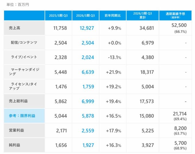 VTuberプロダクション・ホロライブを運営するカバー株式会社は、2026年2月12日に2026年3月期第3四半期決算を報告した。