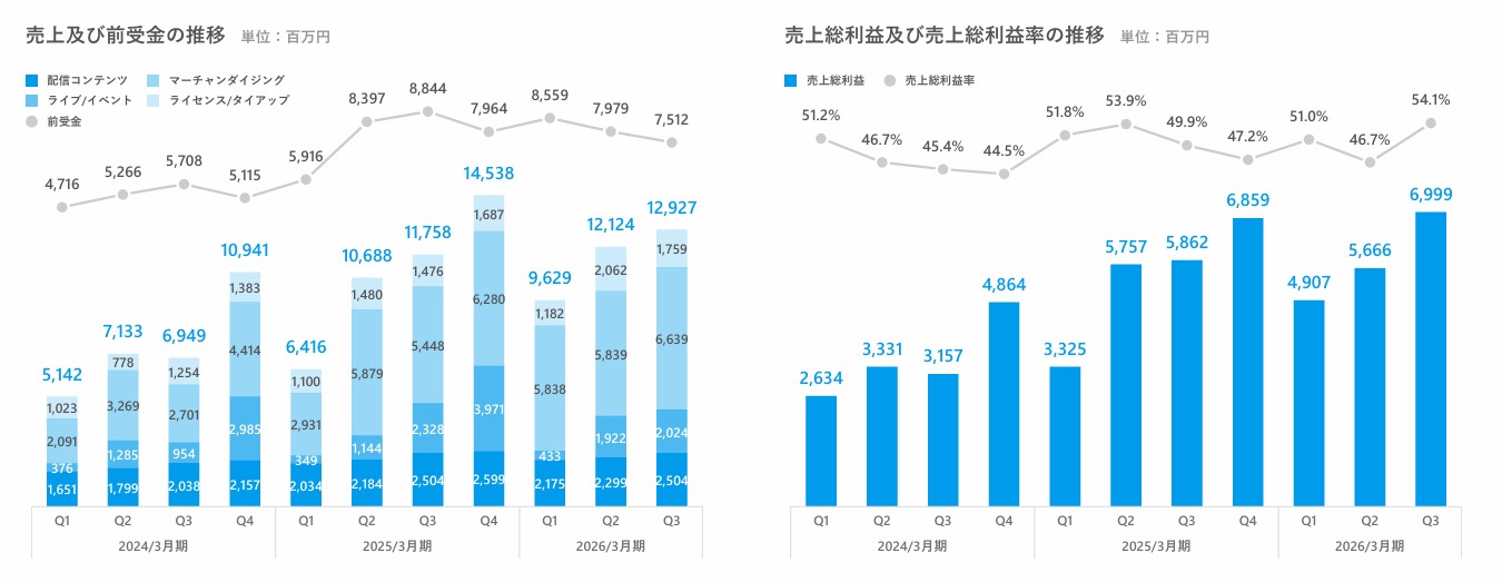 第3四半期は、年末休暇期間の視聴者増や新興タレントコンテンツの盛り上がりにより、配信/コンテンツ分野の収益が復調。ライブ/イベントでは常闇トワやAZKiによるアリーナ会場でのライブコンサートを3本実施し、海外ワールドツアーも複数公演、それぞれ売上に貢献した。