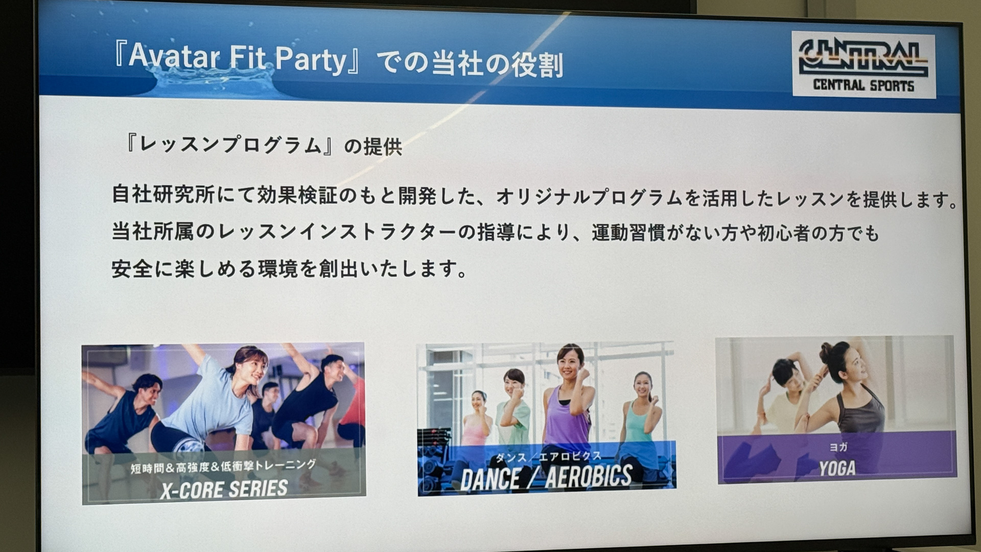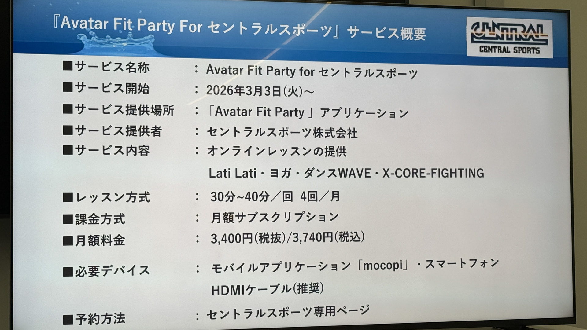 運動のプログラムとしては、セントラルスポーツが3月3日より提供する「Avatar Fir Party for セントラルスポーツ」を利用する。短時間/高強度/低衝撃トレーニング、ダンス/エアロビ、ヨガなどを用意する予定で、価格は月額サブスクリプションで30分/月4回が3740円(税込、以下同)となっている。最低契約月数は3ヵ月だ。