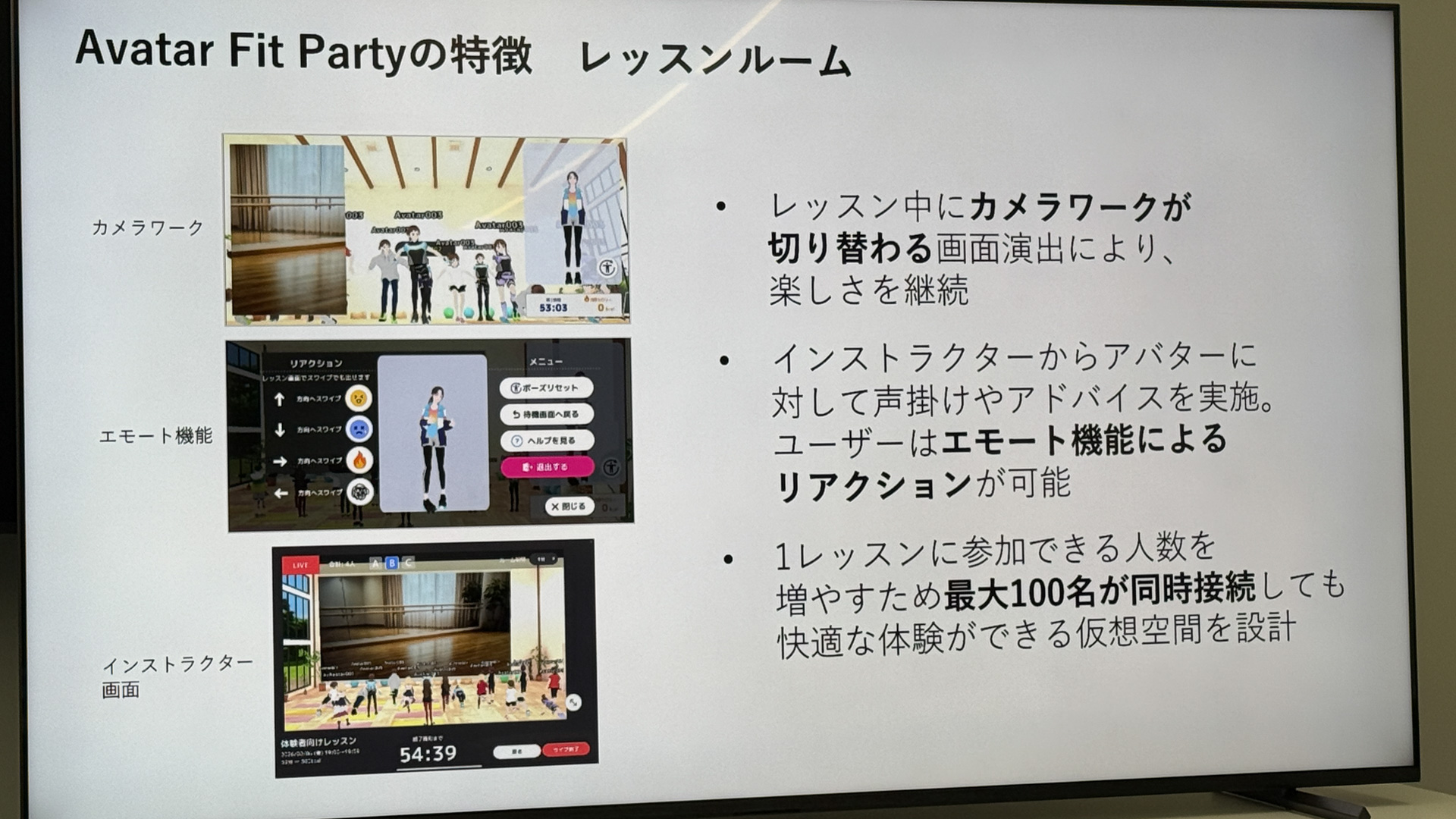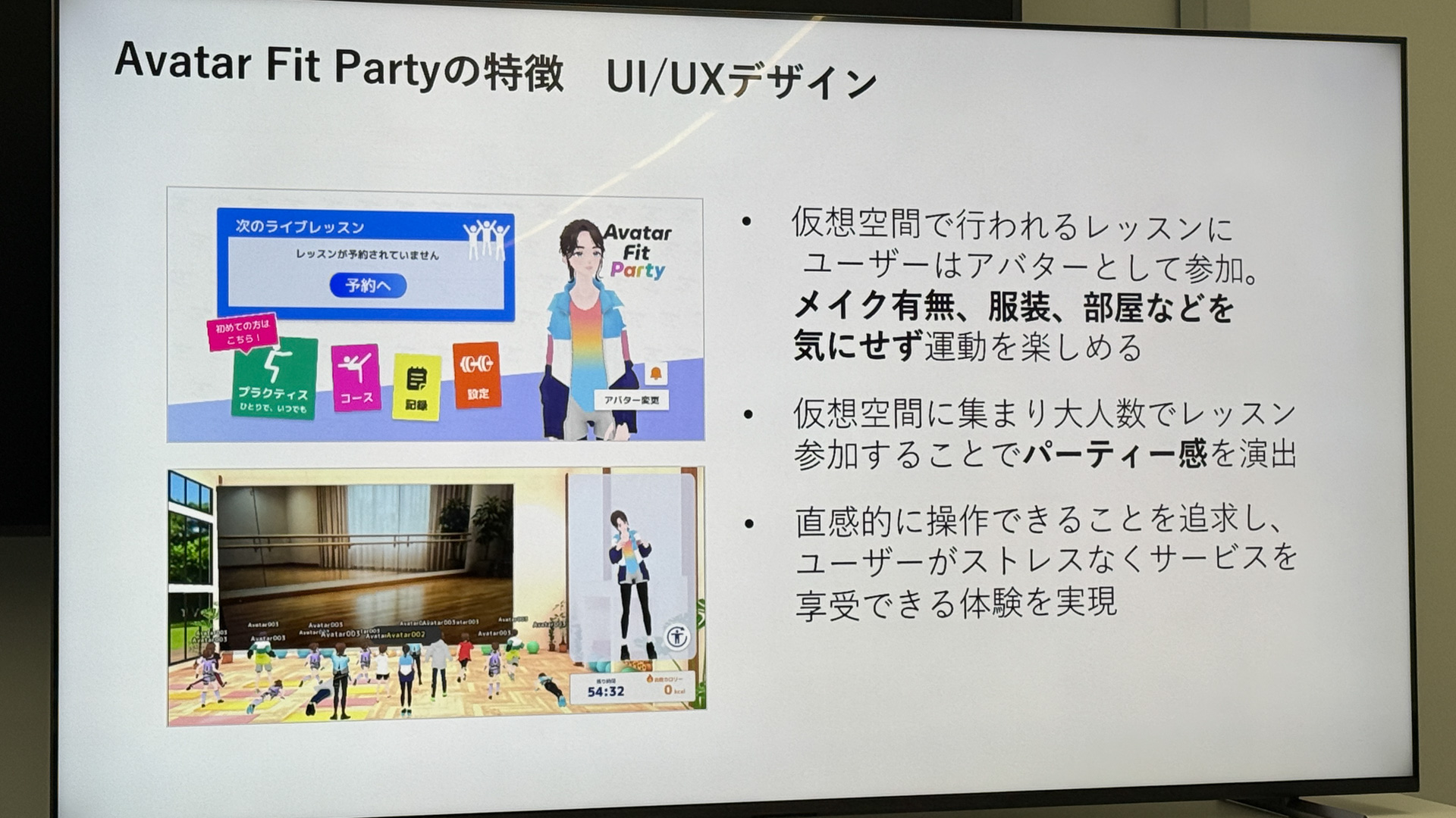 Avatar Fir Partyは、参加者のアバターの様子を見ながらリアルタイムで声掛けしてくれるのでモチベーションにつながる。「いつでも運動できる」ではなく、決まった日時にスタートするというのも、「みんなを待たせたら悪いから……」と運動を継続するモチベーションにつながるだろう。