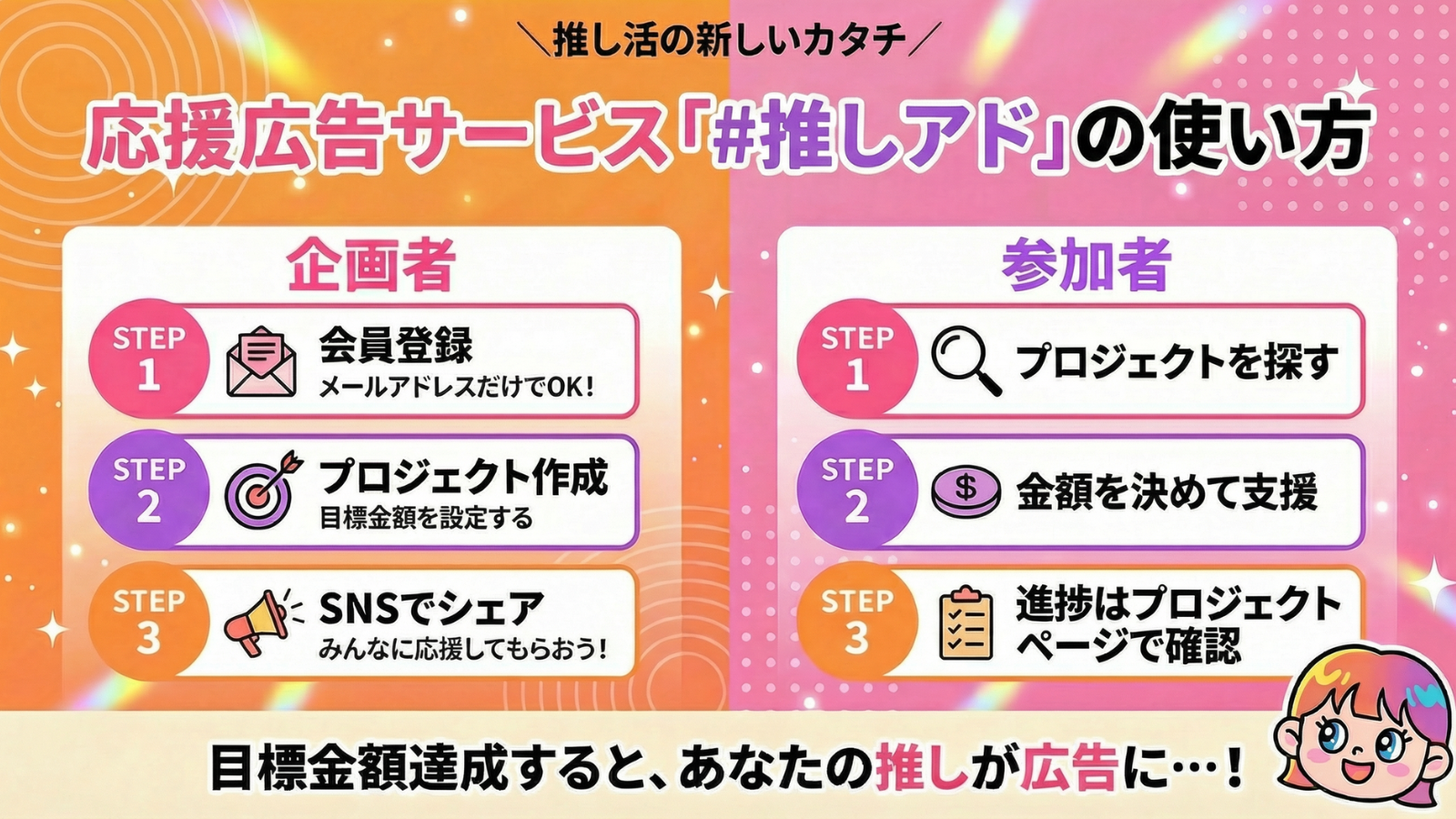 ②プロジェクト作成:応援したい「推し」のための広告プロジェクトを作成し、目標金額を設定