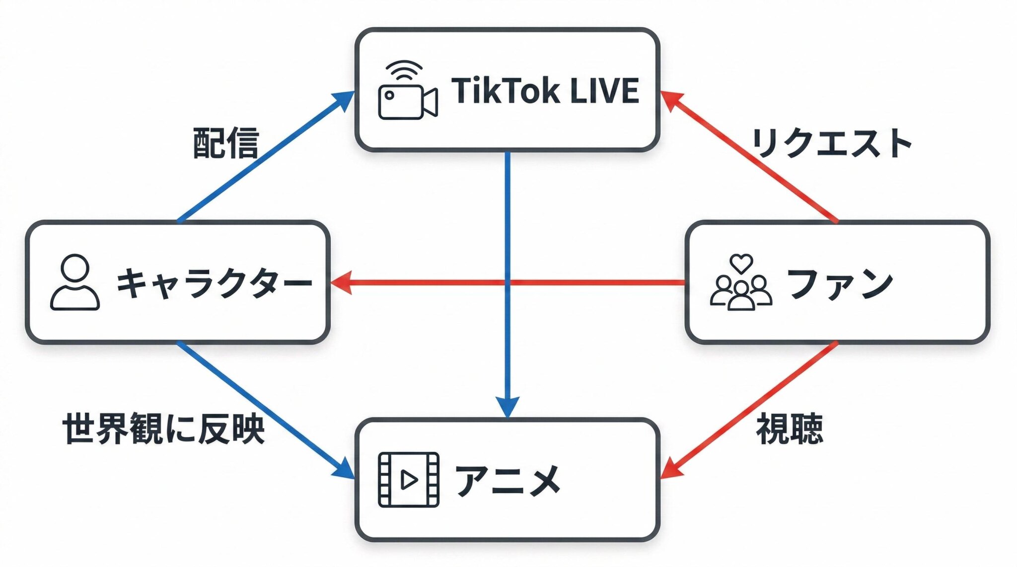 また、TikTok LIVEで生まれた出来事やファンの熱量を起点に、AIアニメーションでショートアニメとして順次映像化され、物語が更新される。さらに、連動型ゲームではメインストーリーを軸に“体験”として世界観を拡張し、音楽・ライブイベント、コミカライズなどへと接続。各メディアが次のフェーズへバトンを渡しながら熱狂を循環させ、ファンと共にIPを継続的に成長させていくとのこと。