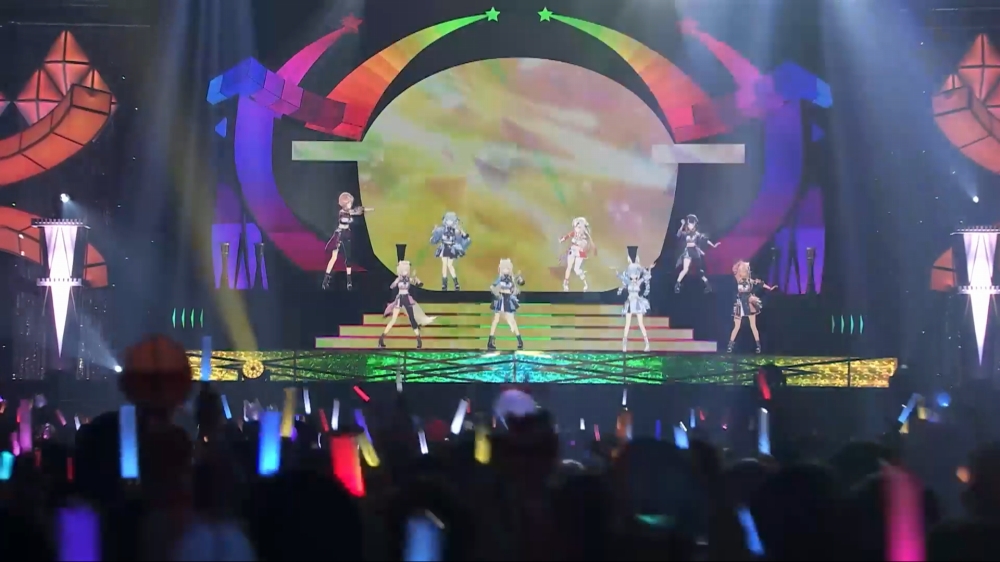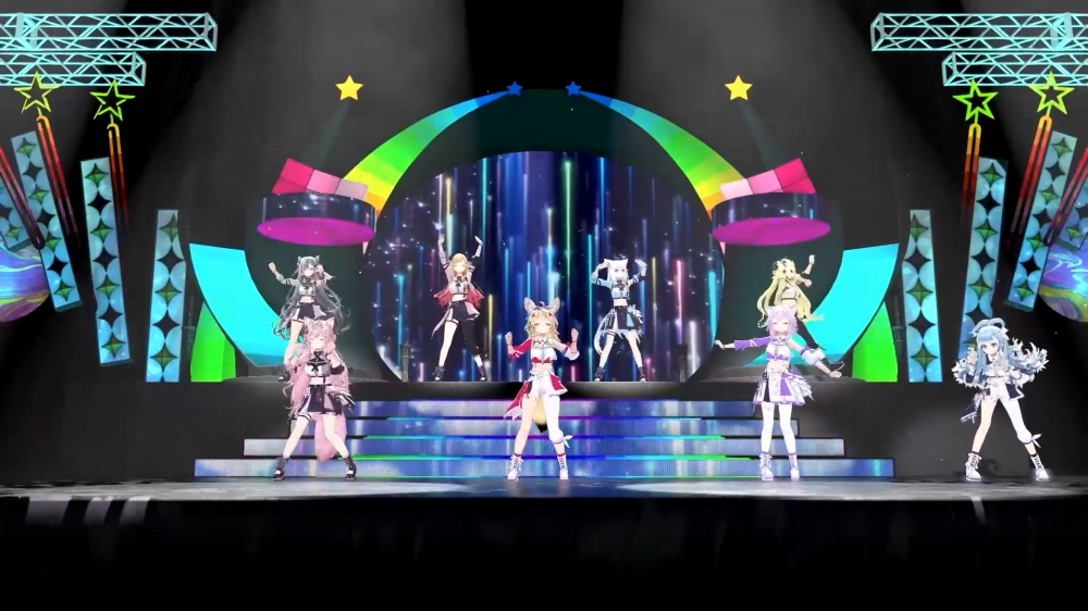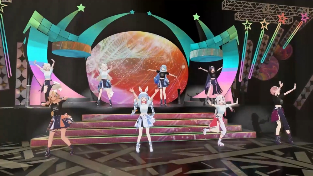 移動ルートが斜めになっているためか、トロッコの奥行きがはっきりと見えて、ホロメンのポジションチェンジも分かりやすい。トロッコがステージ横に到着すると、アウトロの流れる中、トロッコ組のホロメンはステージ下段に瞬間移動。再び、両方のステージに8人ずつが並ぶと、フブキさんが「『7th fes STAGE1』、盛り上がって行きましょう!」と満面の笑顔で叫び、仲間たちと超満員のファンが「イエーイ!」と応えた。