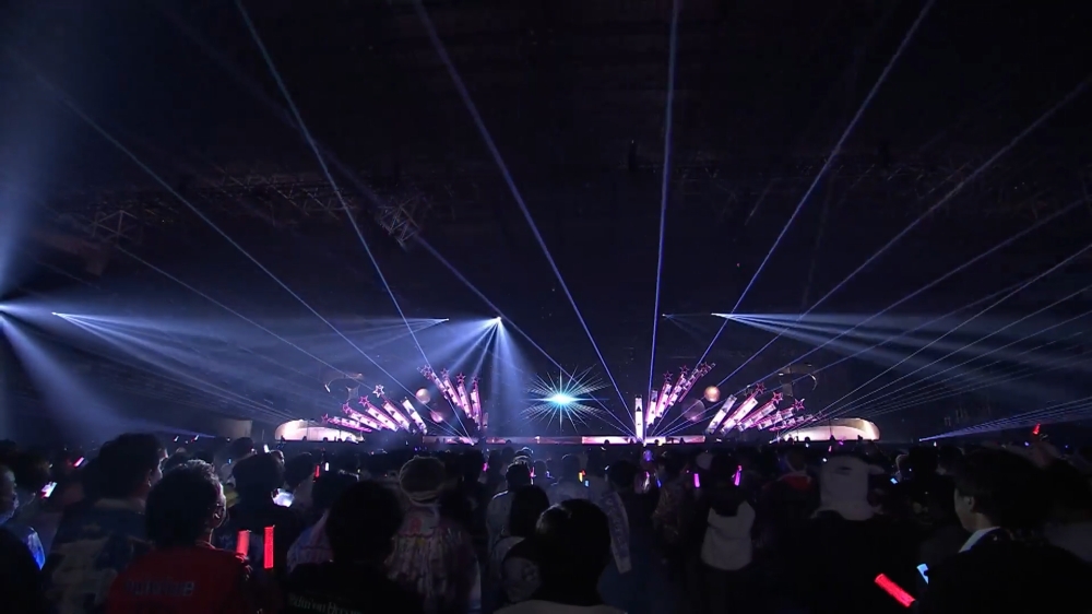 開演までの時間は、いつの頃からかフェスの恒例行事となっているファンによる推しへの愛のアピールの時間。サブモニターには、会場を埋めつくすファンの中から特に目立つ衣装やグッズ、手作りのアイテムなどを身に着けた人たちが映し出されている。今年の客席も非常に国際色豊かだ。