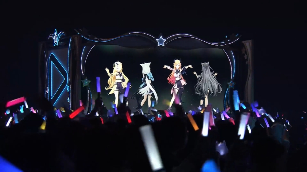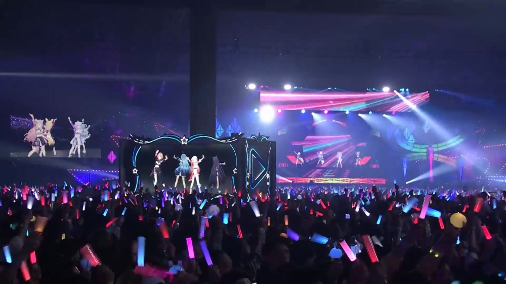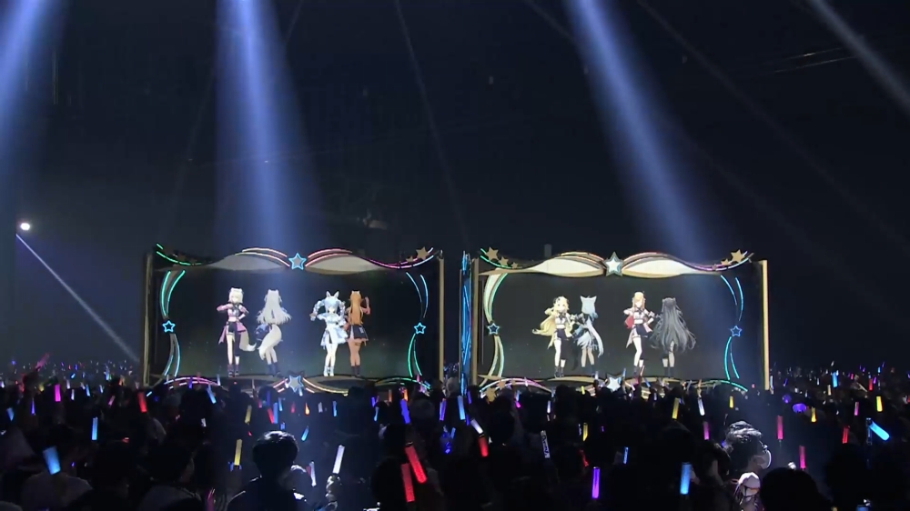 16人のホロメン全員がエフェクトと共に退場し、会場が暗転した後、ステージとトロッコのメンバーが入れ替わって再登場。会場中央のトロッコとステージの出演者が瞬間移動するというリアルのアイドルやアーティストには実現できないバーチャルタレントならではの演出だ。そして、「hololive 4th fes. Our Bright Parade」の全体曲「Our Bright Parade」のメロディーが流れ出し、歌い上げるようなAメロの後、「イエーイ!」という掛け声と共に曲調が変わると、2台のトロッコはそれぞれのステージに戻って行く。