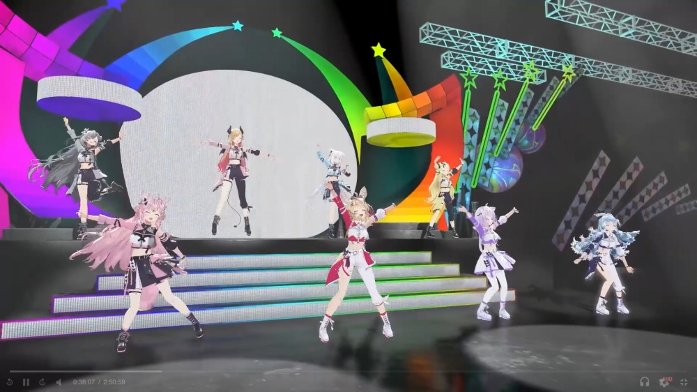 最後に「7th fes」のロゴが大きく映った後、エフェクトと共にファンが待ちに待っていた16人のホロメンが登場。1ホール側のステージには、上段にルイさん、ラミィさん、あやめさん、伊那尓栖さん、下段にフワモコの2人、ぺこらさん、フレアさんが並ぶ。3ホール側は、上段がこよりさん、ポルカさん、おかゆさん、こぼさん、下段にゼータさん、ちょこさん、フブキさん、わためさんの順番だ。16人は、大きく手を振りスタートからハイテンション。「6th fes」の全体曲「Color Rise Harmony」のイントロが流れる中、下段のメンバーはステージの端に移動、エフェクトと共に消えると、ステージ横に待機していたトロッコへと瞬間移動した。