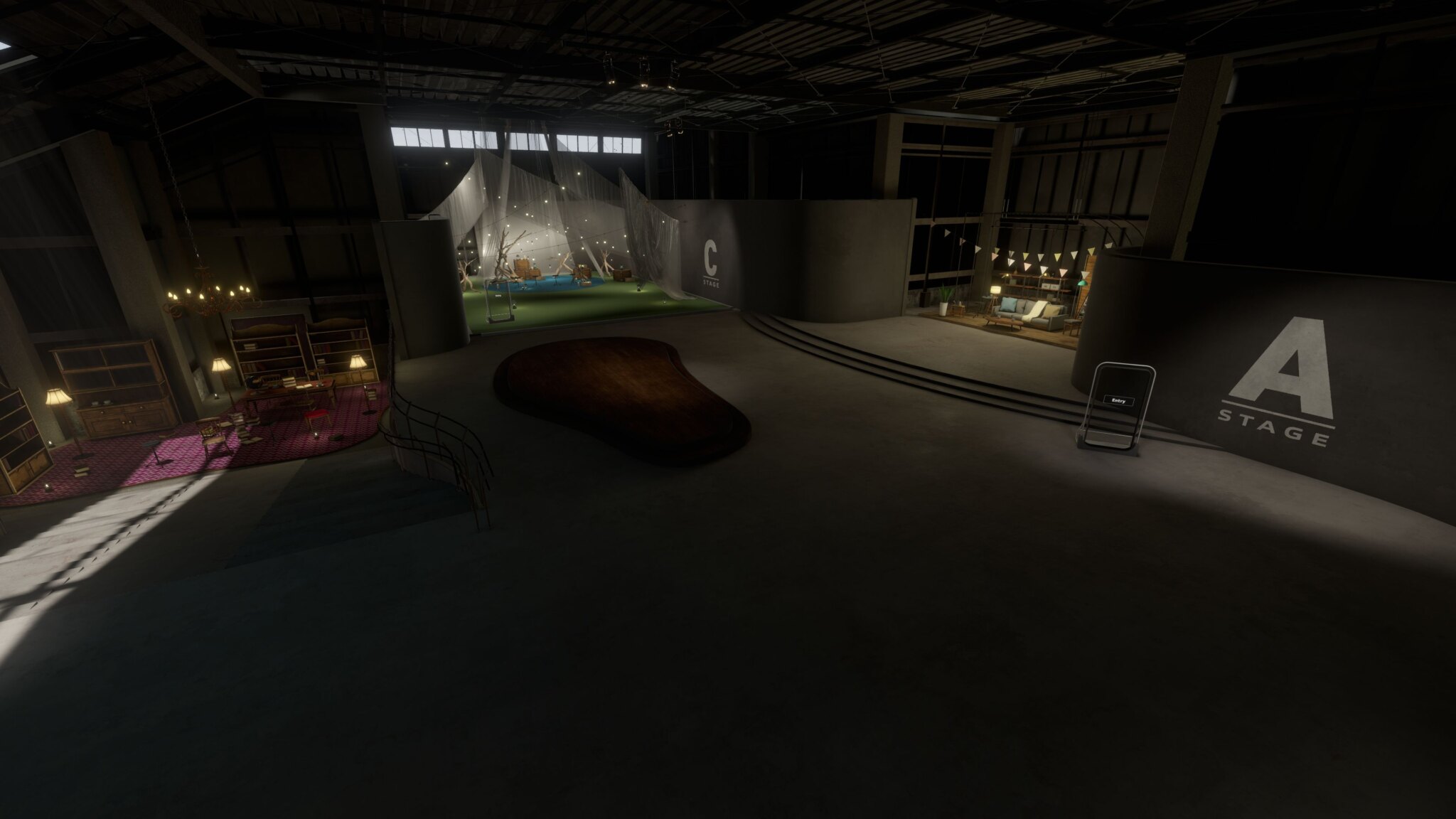 メインとなるのはスタジオエリア。巨大な倉庫のような空間の中に、3つのステージが設営された区画です。