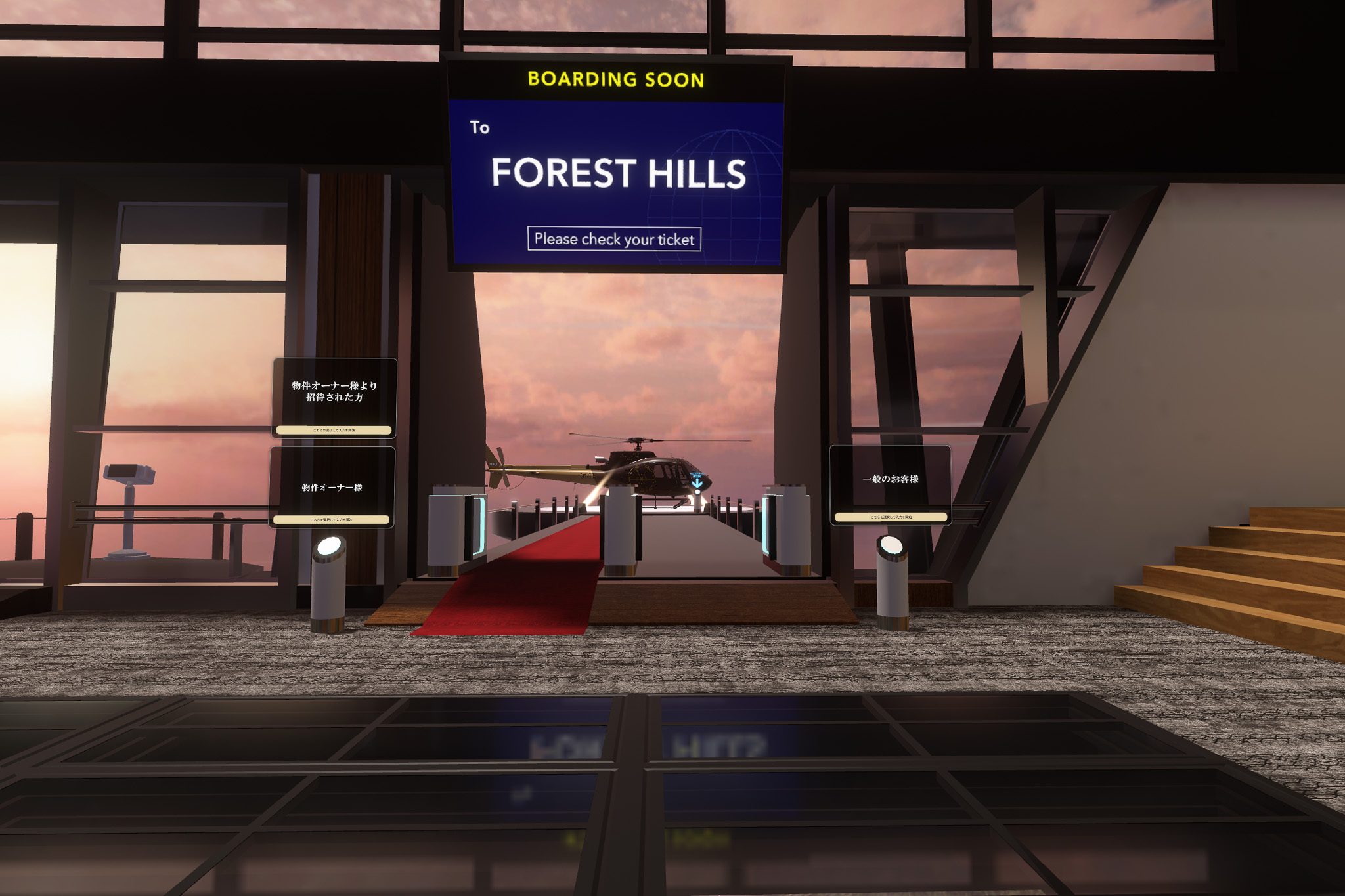 そこから専用ヘリコプターに乗ってレジデンスエリアへ向かうようになっていて、移動の段階から特別感がある。クラスターの方に伺ったところ、エントランス自体を演出するワールドはないらしい。