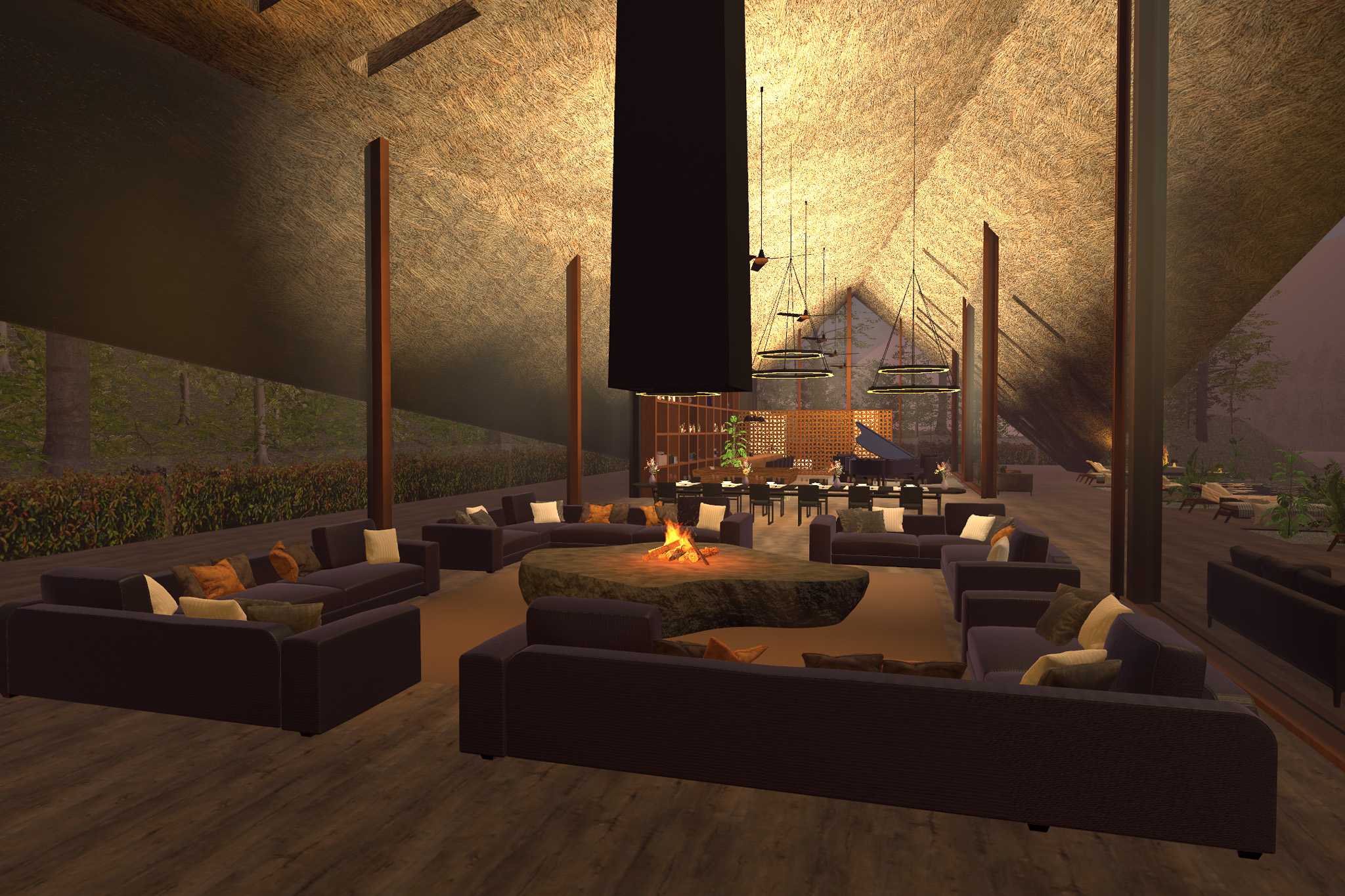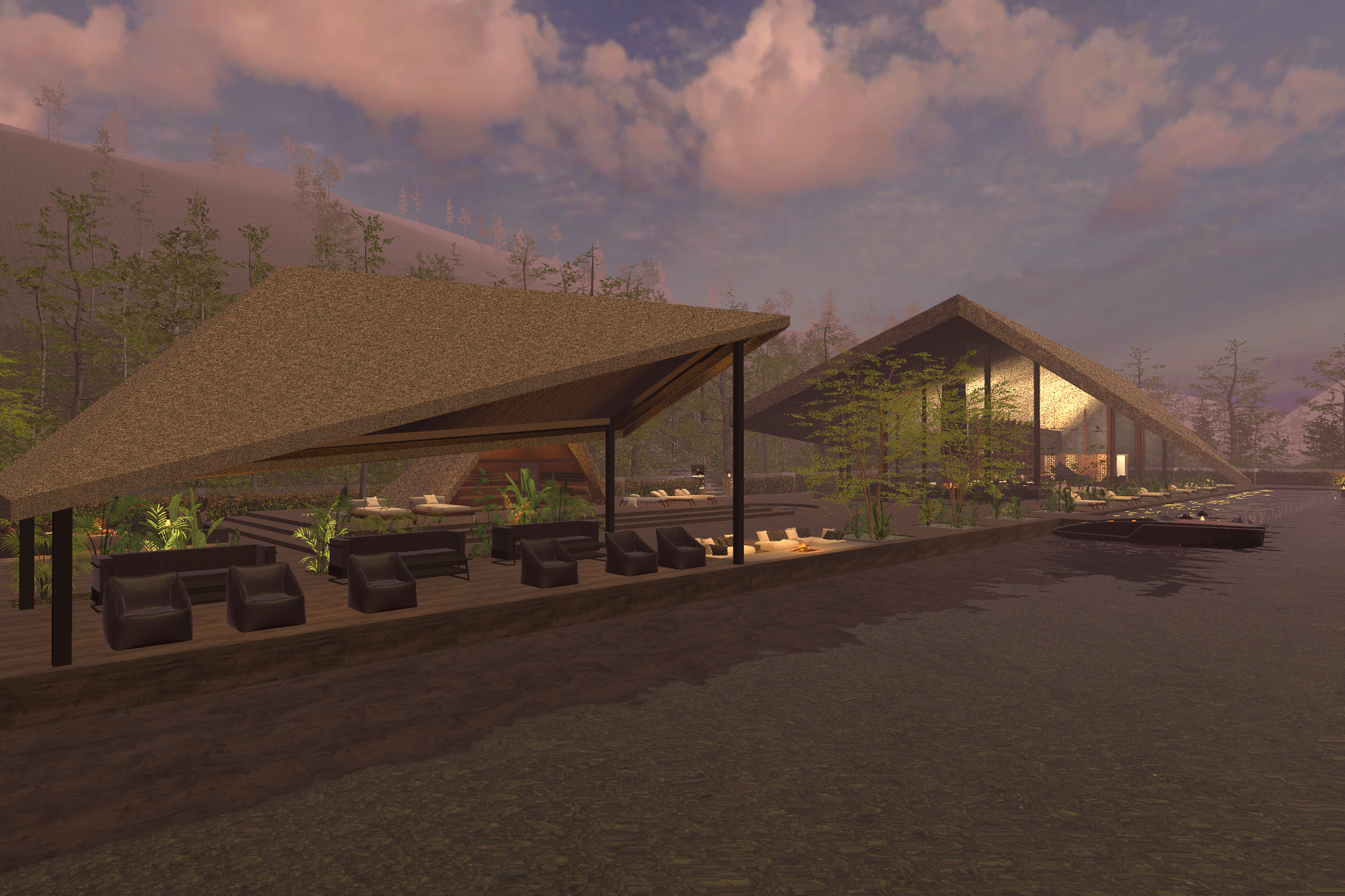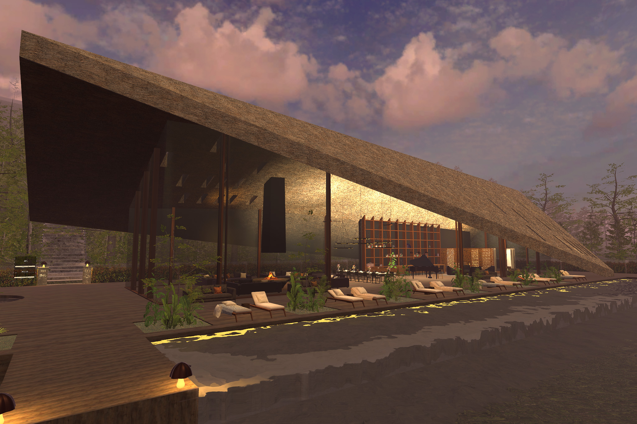 一見すると洗練されたリゾート建築だが、よくみると、「あの家」のかやぶき屋根をモチーフとしたリゾート建築になっている。