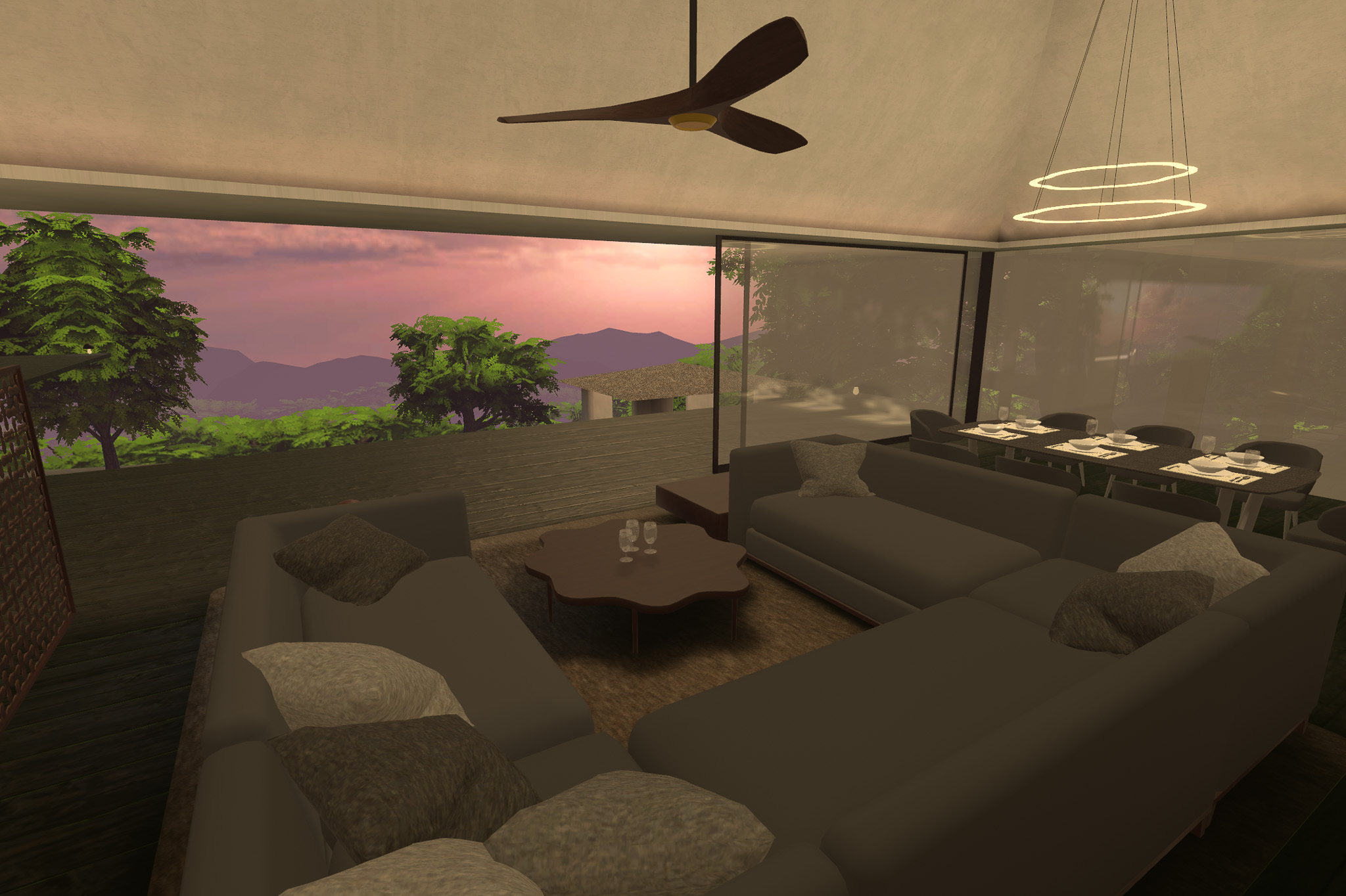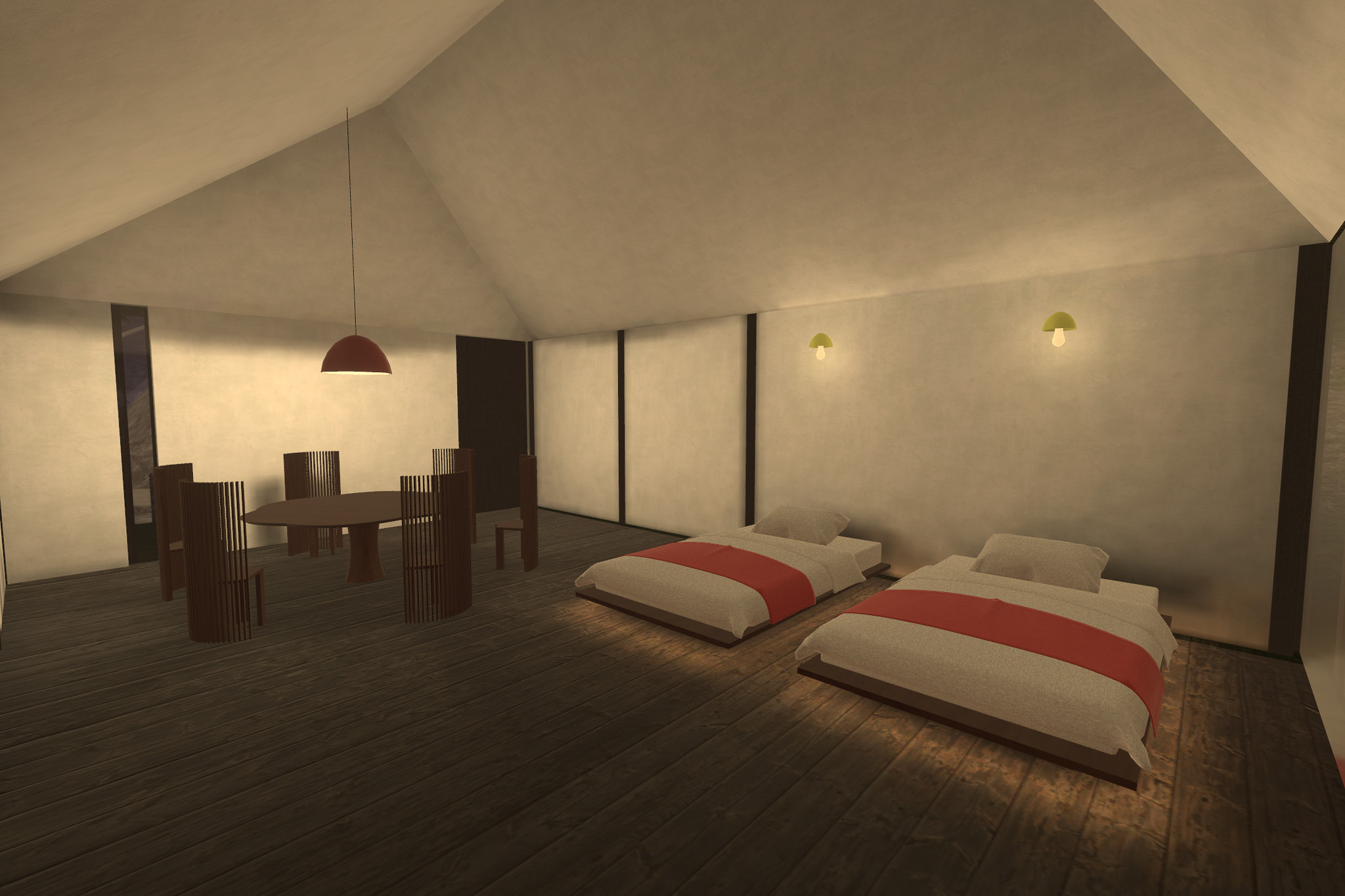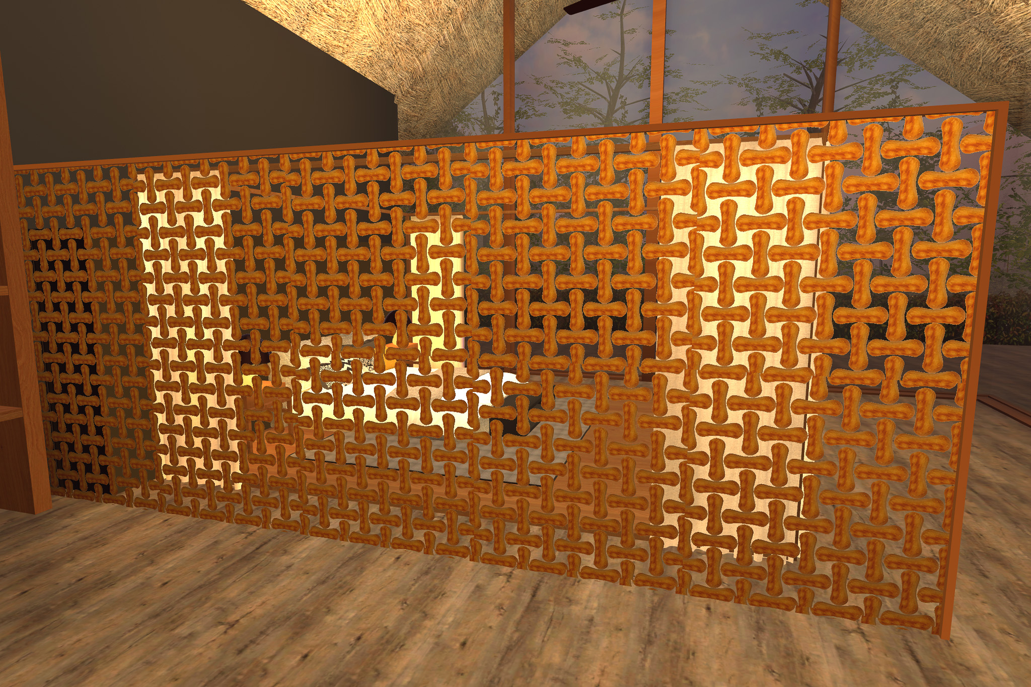 家のデザインや全体の設計などは、この企画のためにデザイナーに依頼してつくったといい、インテリアの配置や自然と調和するリゾート感はプロの仕事を感じる。正直、このパーティションはちょっとトキメキを感じた。