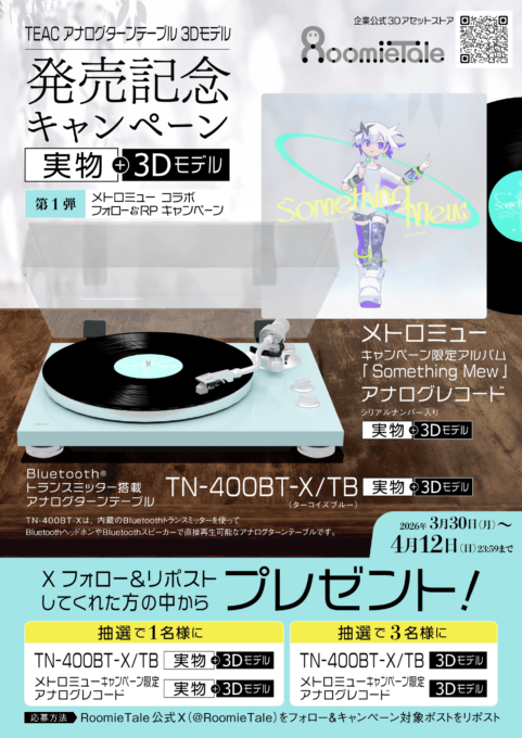 とコラボしたSNSキャンペーンも開催。RoomieTale公式Xアカウントをフォロー&リポストすると、「TN-400BT-X」や本キャンペーン限定レコードの実物や3Dデータが抽選でプレゼントされる。