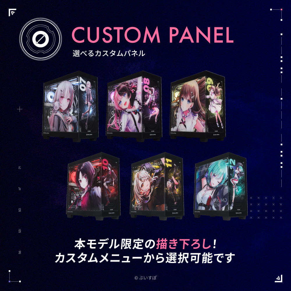 刷新された「ぶいすぽっ!コラボモデル」では、デスクトップにサイドとフロントに強化ガラスを用いたピラーレスデザインを採用。イラストは、全員が揃ったバージョン、もしくは各メンバーが描かれたバージョンがあり、好きなメンバーのデザインを選択可能。メンバーごとにLEDカラーが設定されており、ロゴ入り水冷クーラーも実装されている。メンバー別のイラストは、2回に分けて販売を開始。