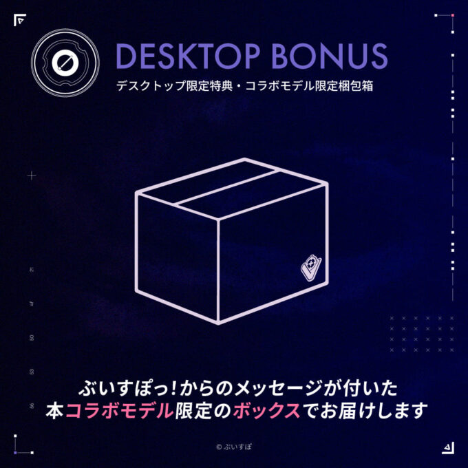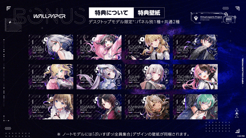 また購入特典として、キャラクターがデザインされたステッカー、A4クリアポスターのほか、メンバー全員が集合したデザインの壁紙3種をインストール。デスクトップで個別メンバーのカスタムパネルをオーダーした場合は、集合デザイン2種と、メンバーに応じてデザインされた壁紙が1種という組み合わせとなる。さらにデスクトップでは、好きなメンバーのシステムボイスを選択でき、オリジナルの梱包箱が使用される。