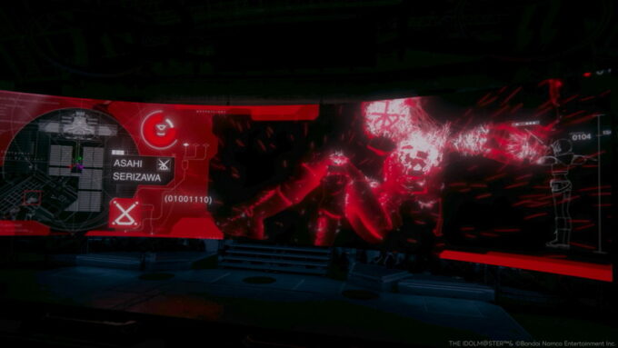 しかし、サビの「熱い鼓動で光線(ヒカリ)は暴れだす」という歌詞のところで芹沢さんの歌唱が止まる。「問題を検出 。ライブを実行してください」というワンちゃんの声を無視して、芹沢さんは舞台裏に駆け出す。それにあわせワンちゃんもステージ上のスクリーンから消えた。