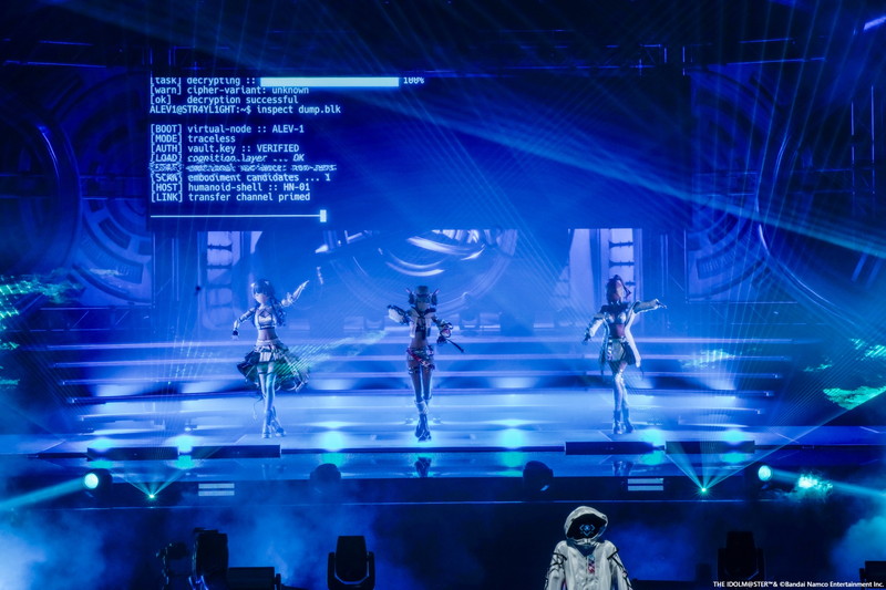 それぞれのソロパフォーマンスを会場に、そしてALEV-1に見せた3名は、再び集合し「Timeless Shooting Star」を披露。「進化続けるAIの支配下で 真価問われるHuman」と歌った後に、恐れることなく「最高の光を放ち」と歌う3名は、ALEV-1の完璧証明に対する、常に最高で最強を目指すストレイライトの宣言であろう。
