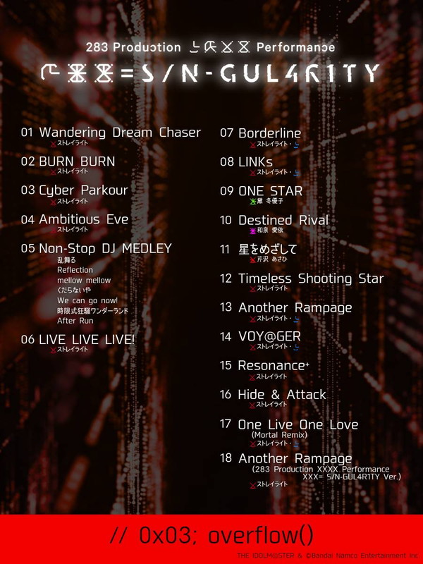 283プロダクション*のユニット「Straylight」(ストレイライト)による単独ライブ「283 Production XXXX Performance XXX= S/N-GUL4R1TY」の第2公演「// 0x02; evolve()」、第3公演「// 0x03; overflow()」が2026年4月12日(日)に幕張イベントホール(千葉県千葉市)で開催された。公演の冒頭部分は無料配信されている(第2公演 / 第3公演 )。