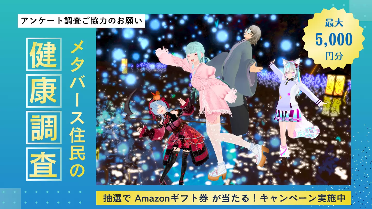 本研究では、メタバース(VRChat, cluster, Resonite, Spatial, Vket Cloud, Roomiq, Rec Room, Roblox, Horizon Worldsなど)に週1回以上アクセスし、日常的に他者との交流や活動を行っている16歳以上のユーザーを対象に健康状態や生活習慣に関するアンケートを実施(回答フォーム)。メタバースユーザーの健康状態に影響を与える因子を明らかにし、健康的なメタバース活用に向けた指針を提案することを目指しているとのこと。また、本研究は学会発表や論文として公開予定となっている。