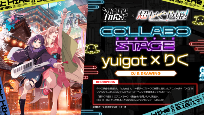 本ステージには、「超かぐや姫!」の楽曲制作を手がけた「yuigot」と、作中のライブシーンの作画に携わったアニメーター「りく」が参加。yuigotのDJプレイと、りくによるリアルタイムのライブドローイングが融合する、NIGHT HIKEならではのスペシャルプログラムとなっている。