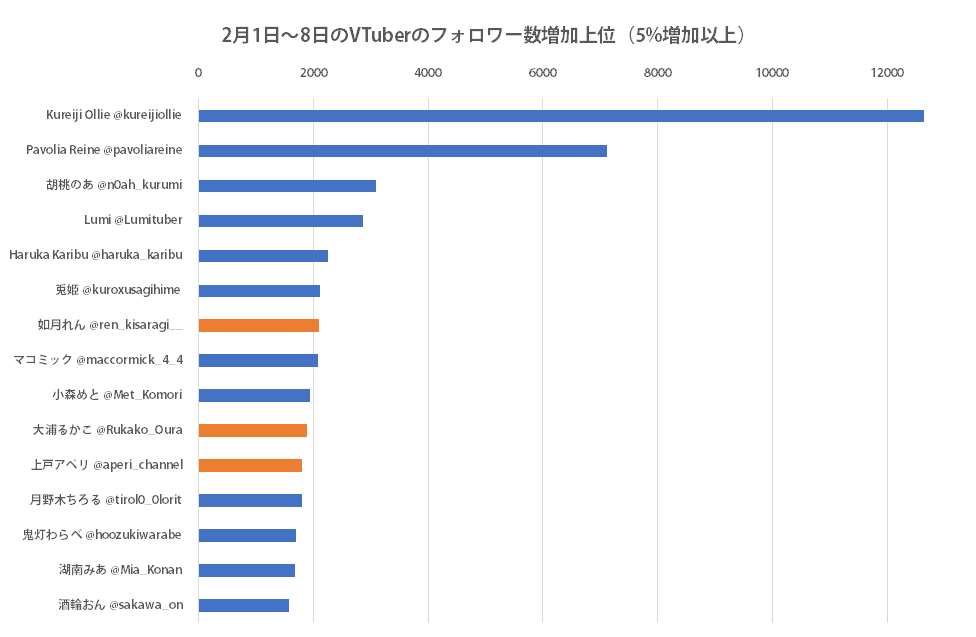 こんにちは。myrmecoleonと申します。今回も最近勢いのあるVTuberを紹介していきます。以下は直近にTwitterのフォロワー数が急増したVTuberを並べたグラフです。今回はここから、いずれもフォロワーが30%以上増加した如月(きさらぎ)れんさん、大浦(おおうら)るかこさん、上戸(かみど)アペリさんの3名をピックアップ。伸びた原因も推測しつつ、プロフィールをまとめました。
