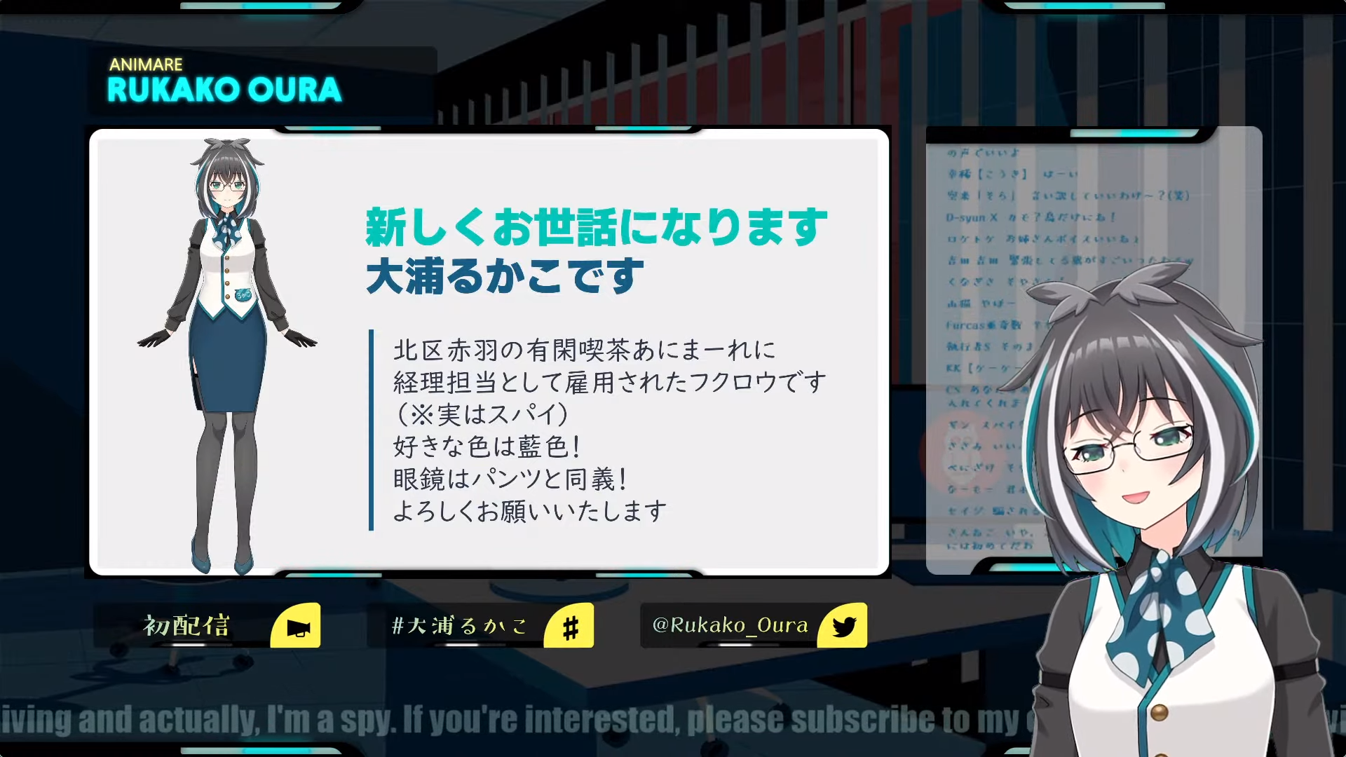 大浦るかこさんは前回紹介の月野木ちろるさん、湖南みあさんとともに2月7日に初配信した774 inc.のVTuberグループ「有閑喫茶あにまーれ」の新人店員のフクロウ。経理担当だが実はスパイだといい、趣味は読書でアイドル好きの元吹奏楽部。初配信やその前のツイートでは暗号めいた謎解きで楽しませるなど知性的なところを見せましたが、初配信最後のラップでは「体液出したいよ」と歌いリスナーをドン引きさせ、翌8日の同期3人の初コラボでは月野木ちろるさんを的確にいじり倒すドSなところを見せました。