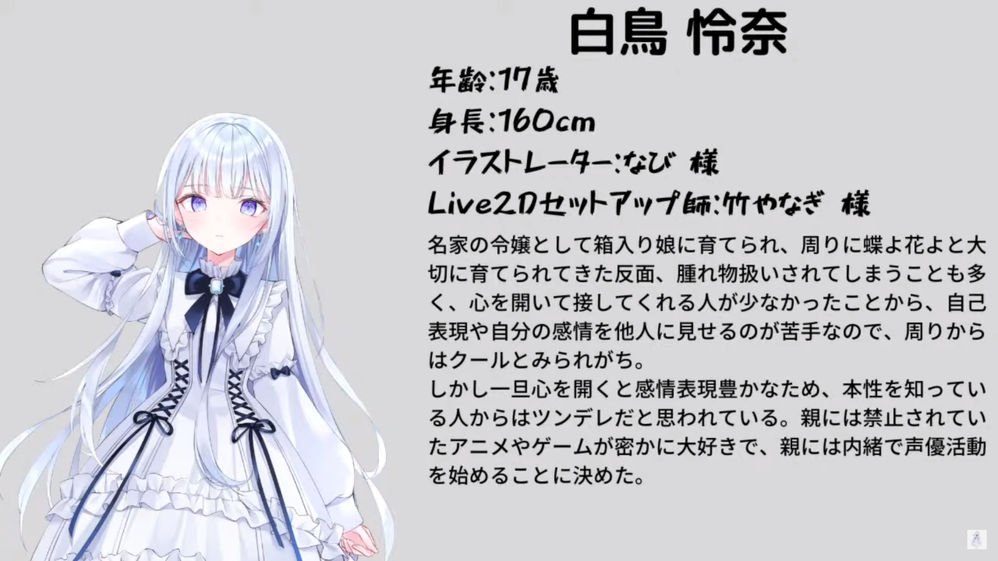 白鳥怜奈さんはその1期生として日向こがねさん、蒼井美月さんとともに2月23日にデビューしました。名家のお嬢様ですがゲームやアニメが好きで、親に内緒で声優活動を始めたとのこと。特に「ゼルダの伝説」シリーズが好きで、そこで声優をするのが目標。話せるのは日本語だけでなく独学でドイツ語も勉強中。24日に個人の初配信を行い、以降ゲーム配信を中心に活動しています。今後はASMRなども予定しているとのこと。