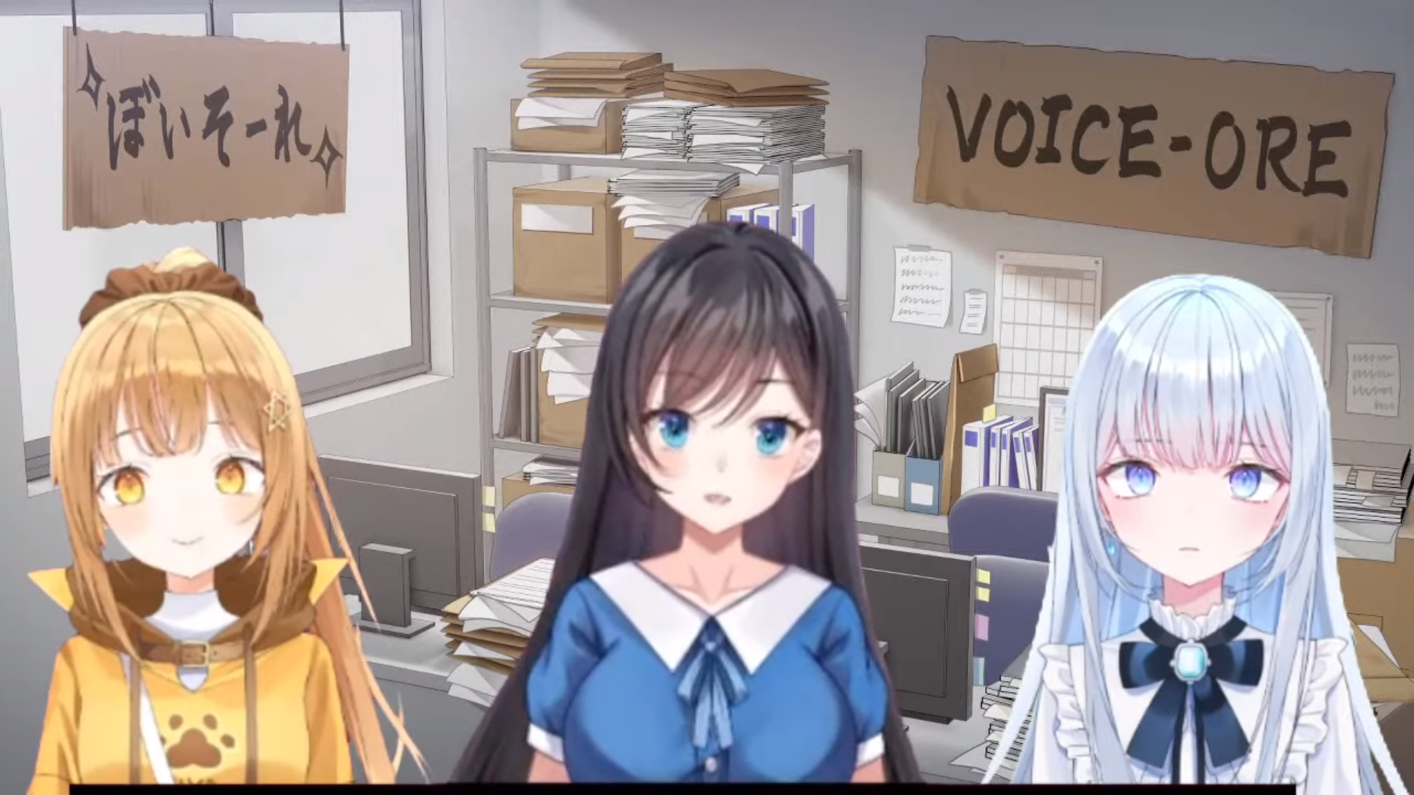 ぼいそーれ1期生デビュー配信よりスクリーンショット。左が日向こがねさん、中央が蒼井美月さん。