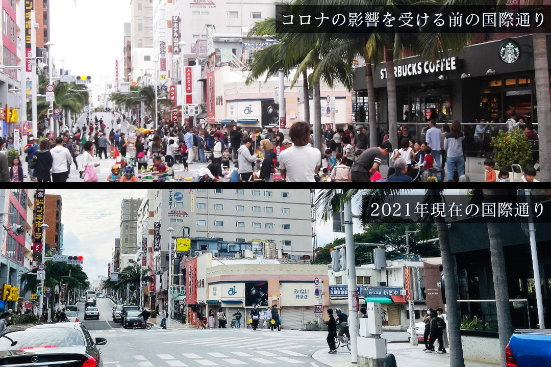 現在、国際通り商店街は新型コロナウイルス感染症拡大の影響で、海外はもちろん、国内の旅行者も激減。歩いている人もまばらとなり、シャッターを下ろしたままの店も少なくない。