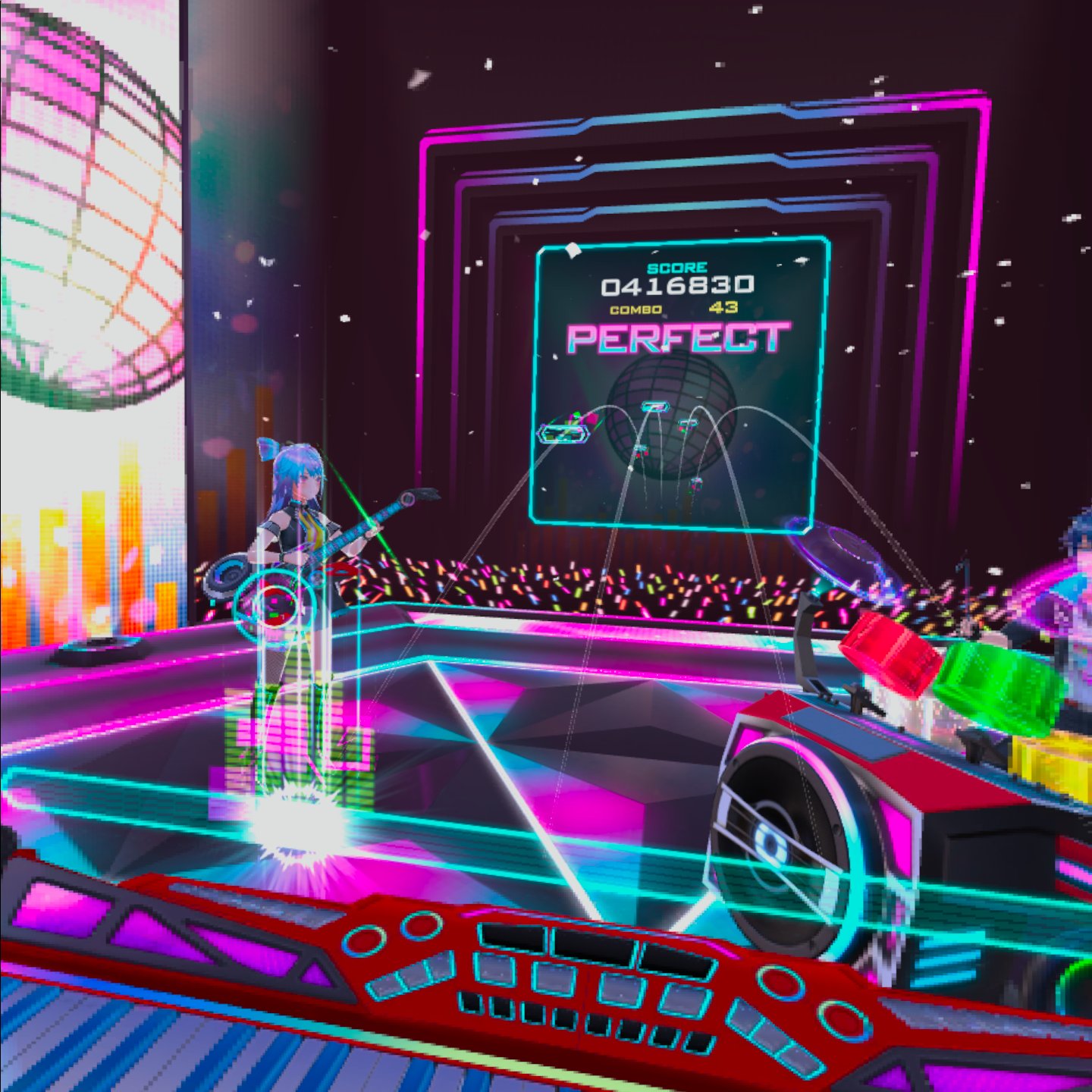 簡単にいうとVRバンド演奏ゲームで、プレイヤーはギター、ベース、キーボード、ドラムの4種類の楽器を実際に演奏しているような体験が可能だ。本作向けのオリジナル楽曲だけでなく、同社が提供する「beatmania」に端を発する音楽ゲームブランド「BEMANI」よりシリーズ楽曲を多数収録しているのも特徴となる。今回、先行体験の機会を得たので、早速レビューしていこう。