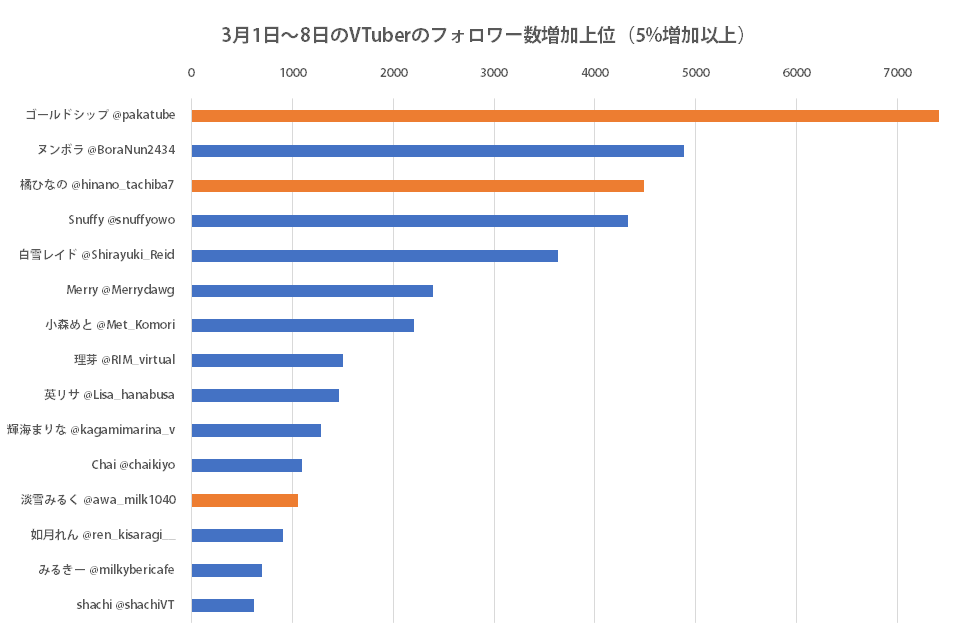 VTuberリスト登録のTwitterアカウントから、2021年3月1日13時から8日13時にフォロワー数が5%以上増加したうちのフォロワー数増加上位。データはTwitter APIより取得(以下同じ)。記事で取り上げたアカウントの棒グラフはオレンジ色に変えた。