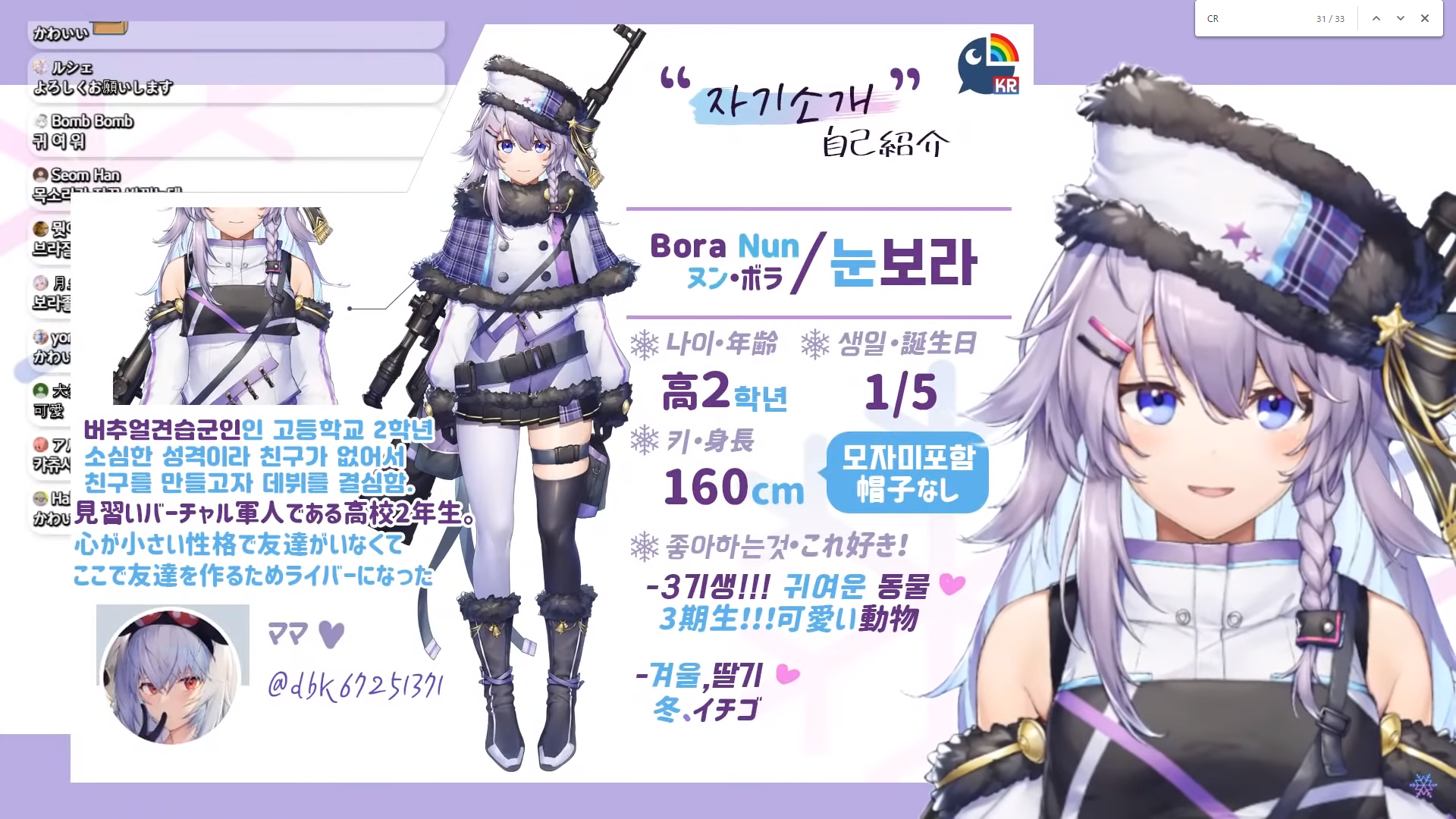 ヌン・ボラさんはにじさんじの韓国事業「NIJISANJI KR」3期生の見習いバーチャル軍人。2020年8月に初配信。活動はゲーム「Apex Legends」のプレイ配信が中心ですが非常に上手く、全てのレジェンドでのハンマー所持、今月に入ってマスターランクに到達と、VTuberの中でもAPEXのトッププレイヤーのひとりです。ゲームの強さの一方で可愛い声も魅力的で、最近では歌ってみた動画も投稿。また韓国語だけでなく日本語も話せます。