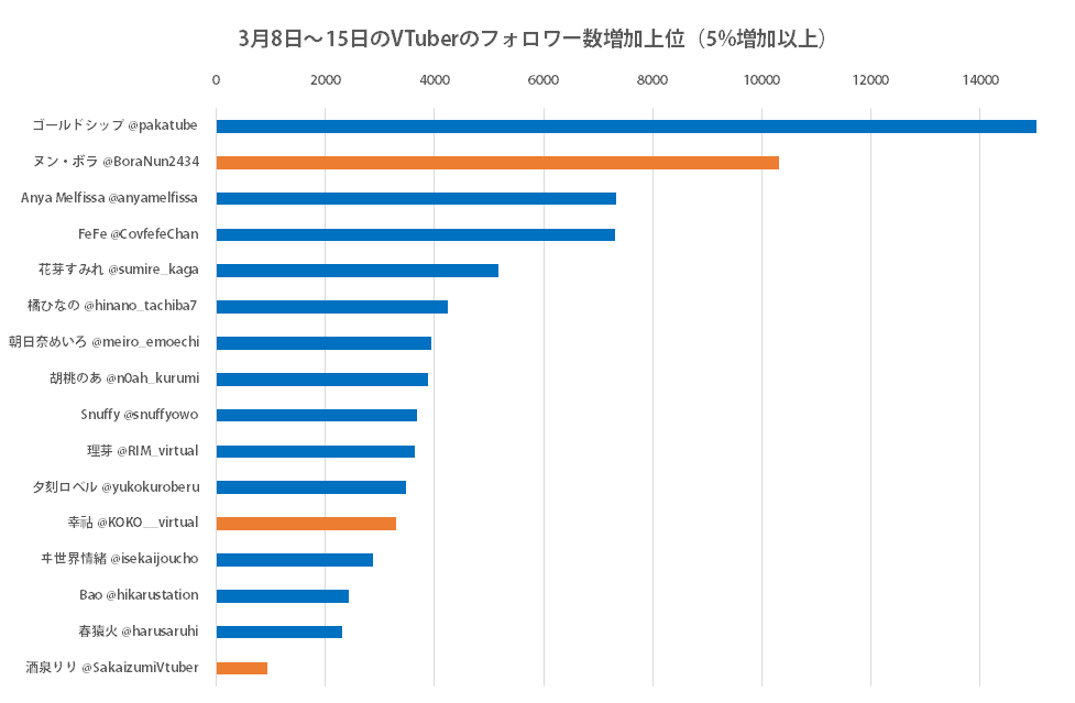 VTuberリスト登録のTwitterアカウントから、2021年3月8日13時から15日13時にフォロワー数が5%以上増加したうちのフォロワー数増加上位。データはTwitter APIより取得(以下同じ)。記事で取り上げたアカウントの棒グラフはオレンジ色に変えた。酒泉りりさんのみピックアップのため上位ではないが追加。